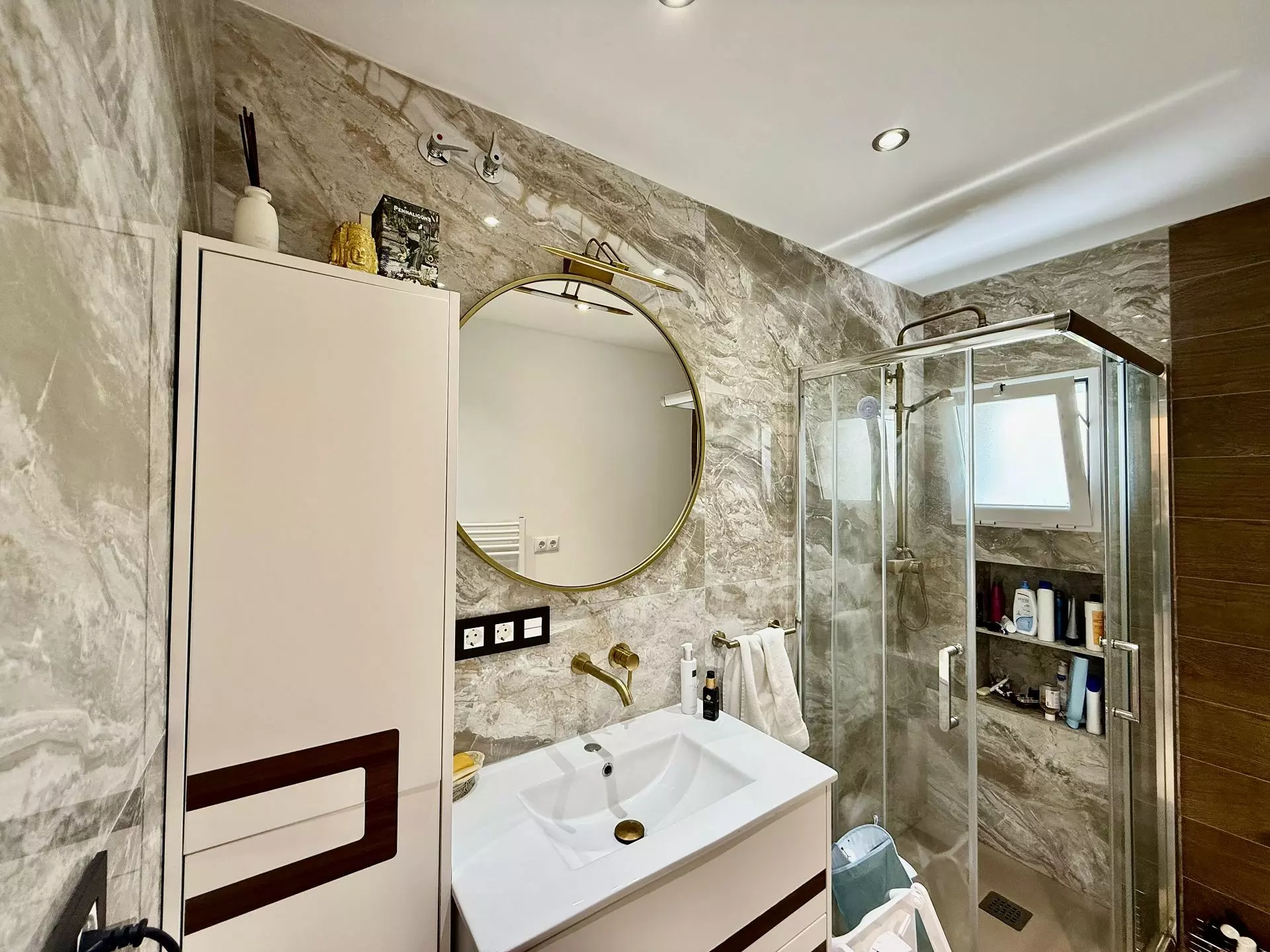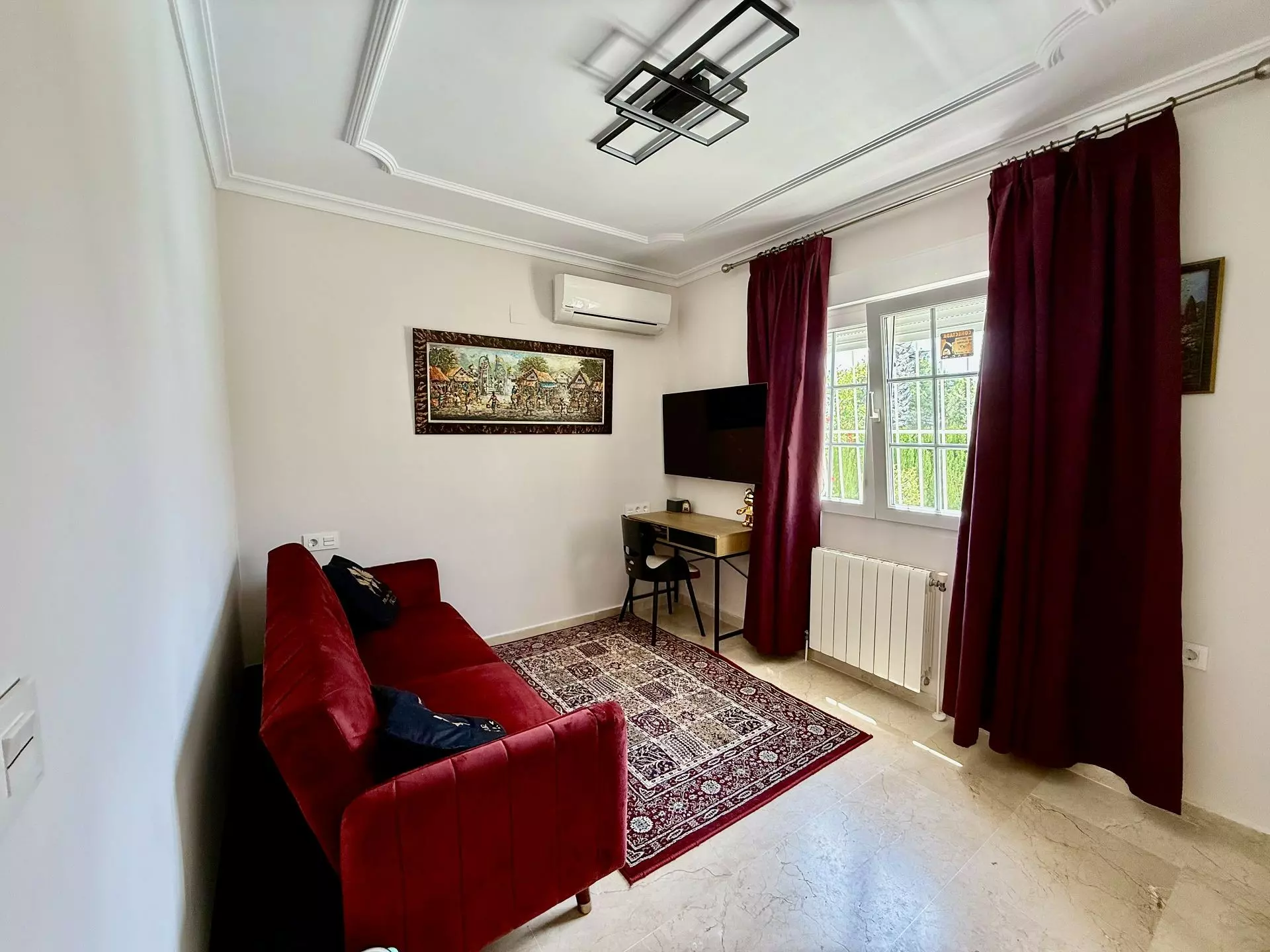 The second story contains two additional bedrooms, characterized by natural light and built-in storage solutions. A notable aspect of this level is the bathroom, which includes high-end finishes. This bathroom is designed to provide a retreat-like experience. Additionally, there is access to a private terrace with views of the sea and the nearby golf course.