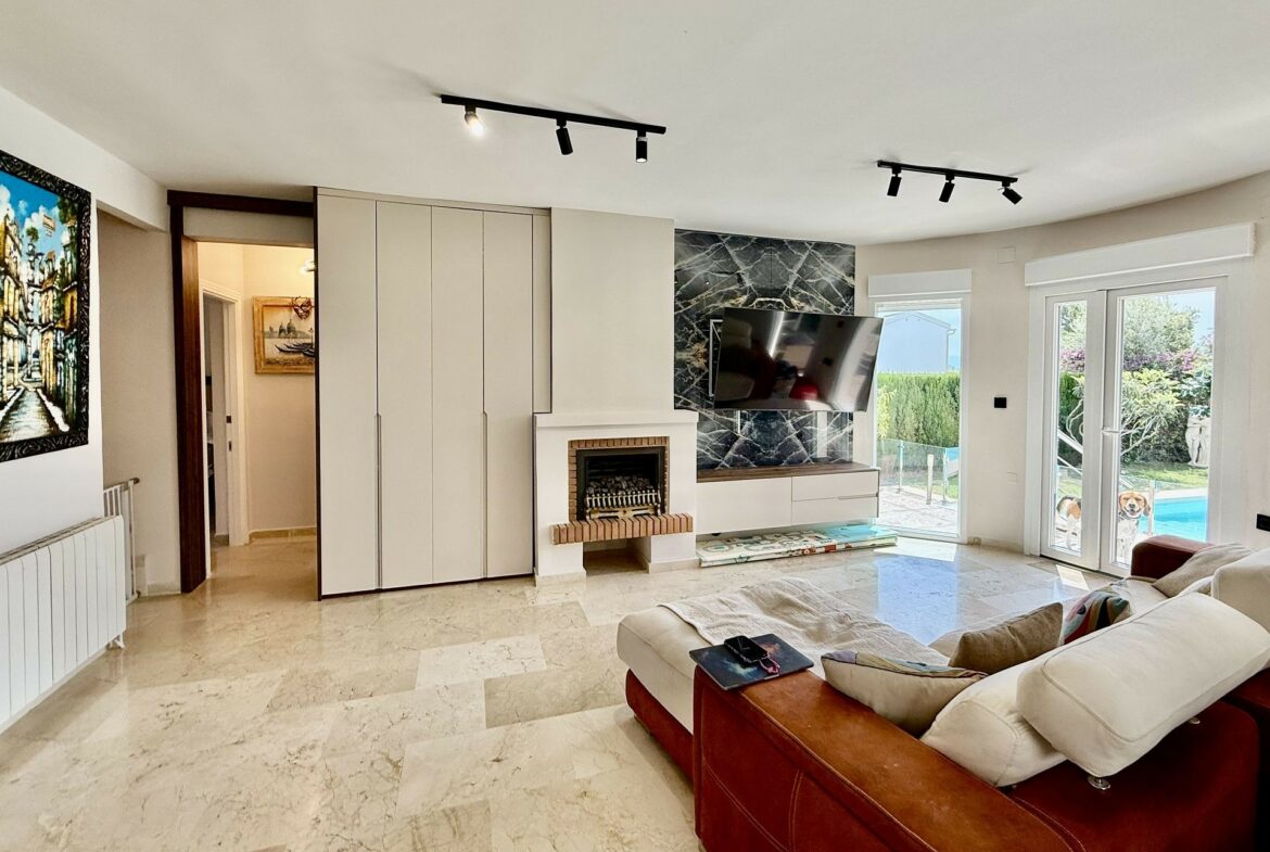 Upon entering the villa, visitors will find a living and dining area that flows into an open-plan kitchen. Large windows provide a view of the swimming pool, creating an airy atmosphere. The ground floor includes two bedrooms, a modern bathroom, and a laundry room, offering convenience and ample storage space.