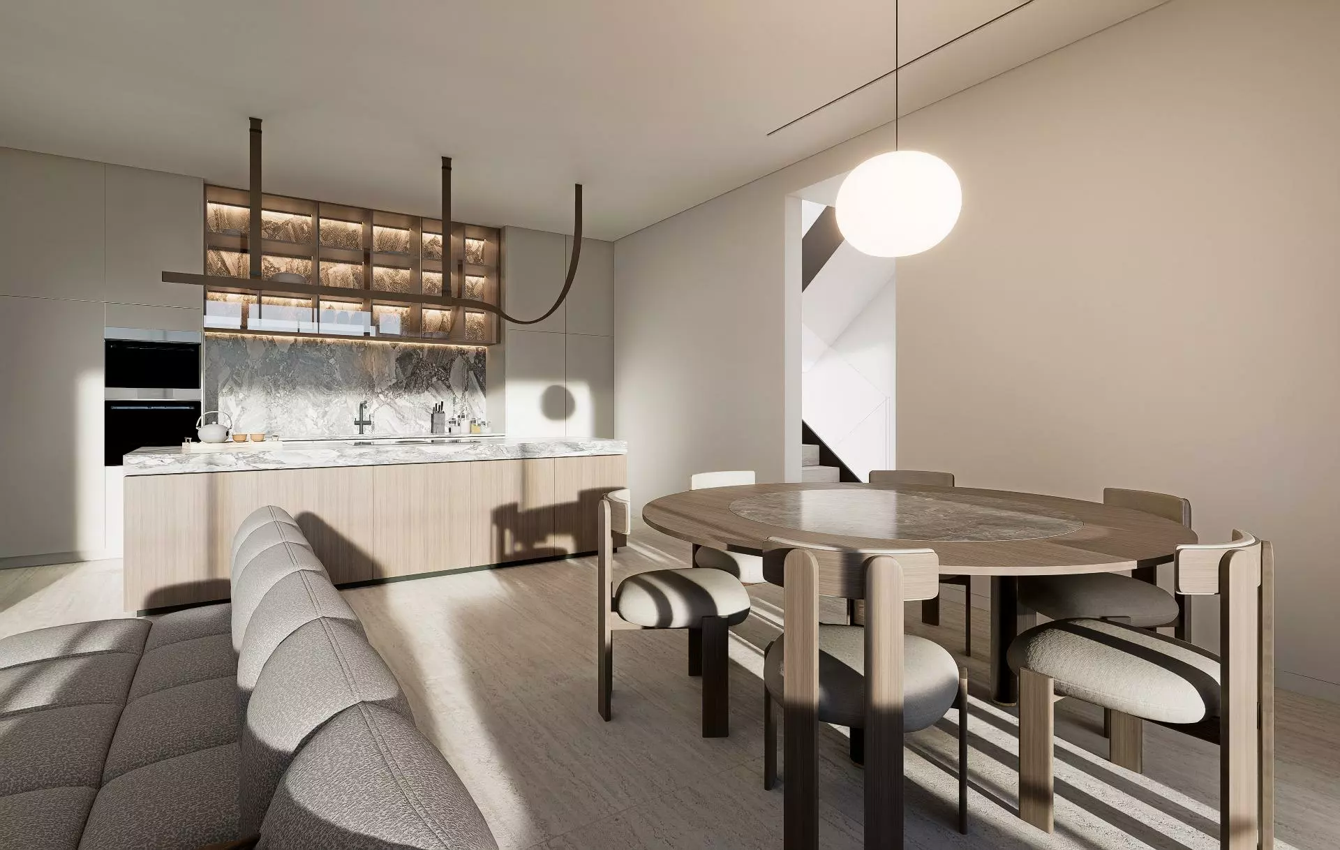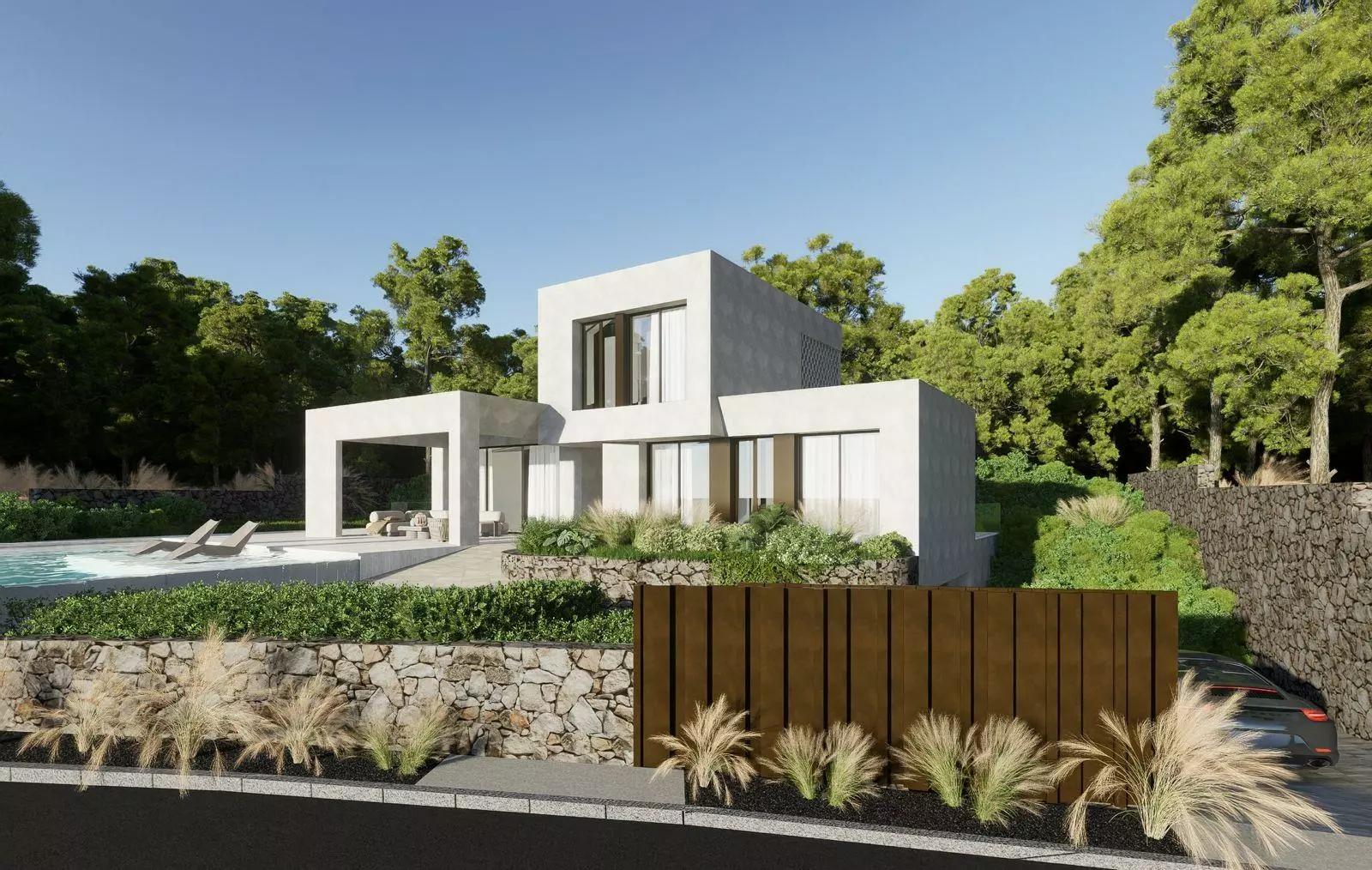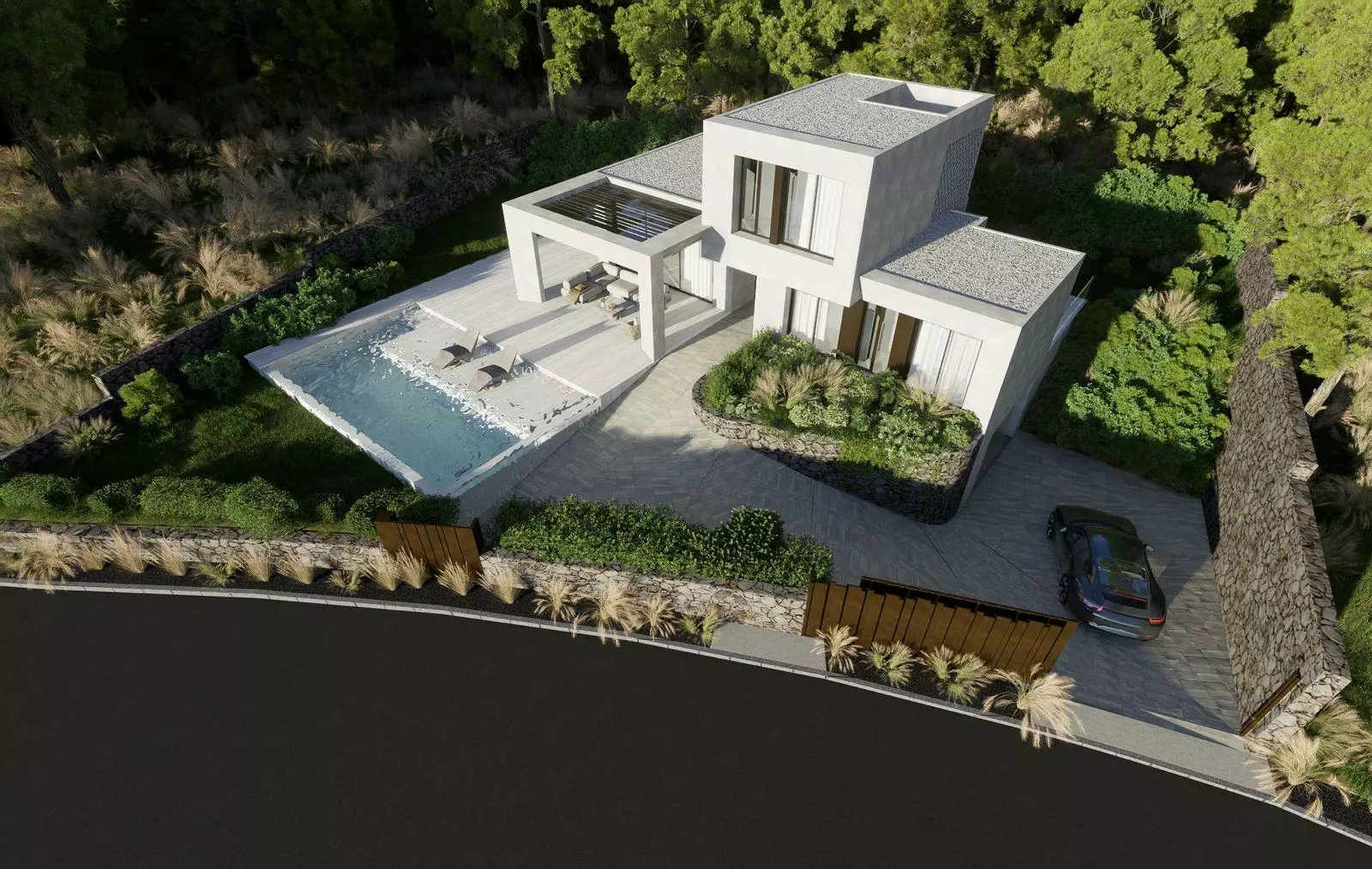 This villa features a practical design spread over two floors along with a basement. It includes three bedrooms, each equipped with its own ensuite bathroom, plus an additional guest toilet. The ground floor incorporates an open-plan kitchen that connects to the living area, two bedrooms, and leads to a large terrace with a private 60 square meter swimming pool and landscaped garden. The first floor hosts a private bedroom suite. The basement offers a spacious garage that accommodates two cars and benefits from natural light and ventilation through an English patio.