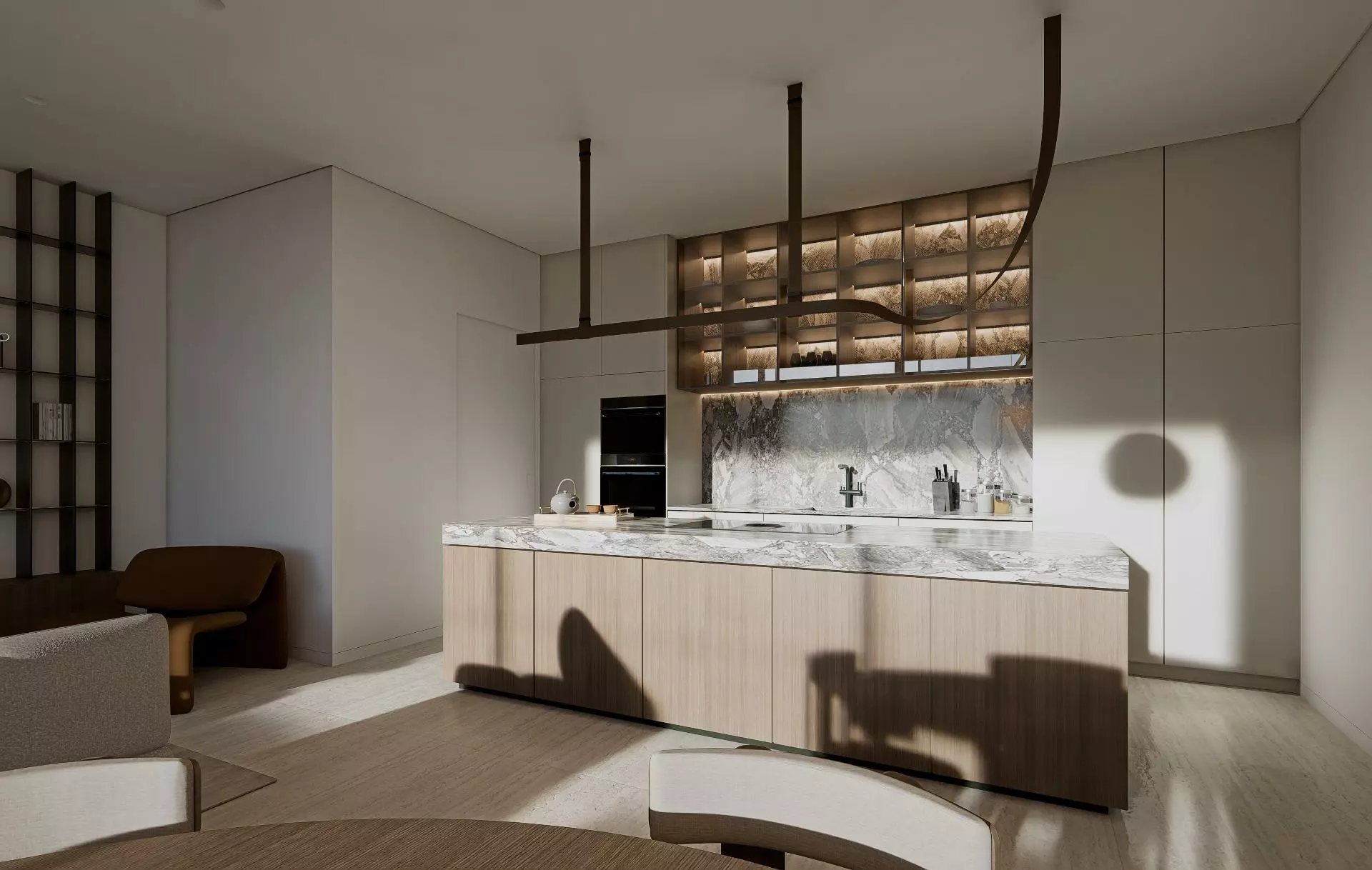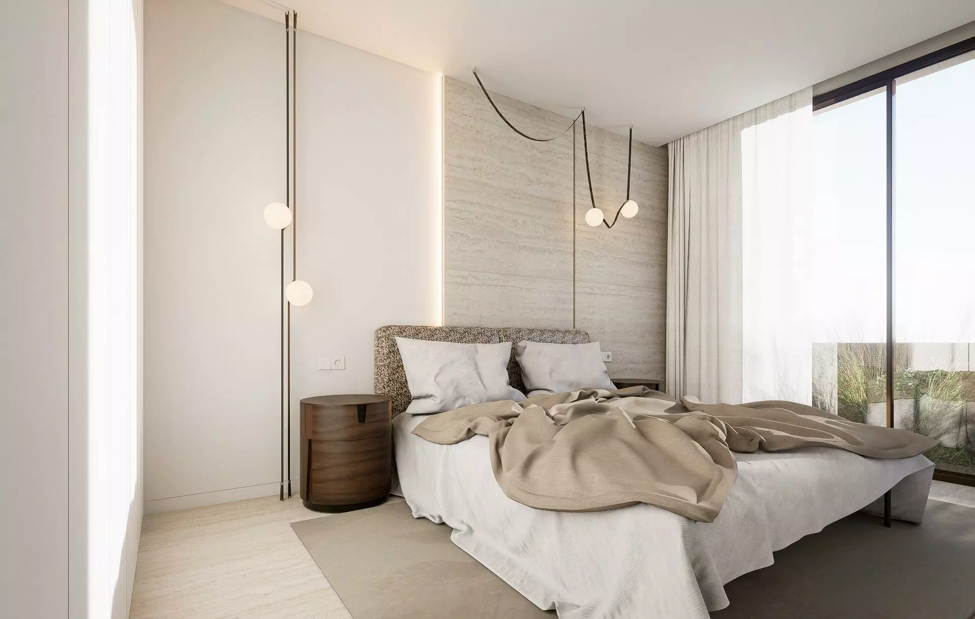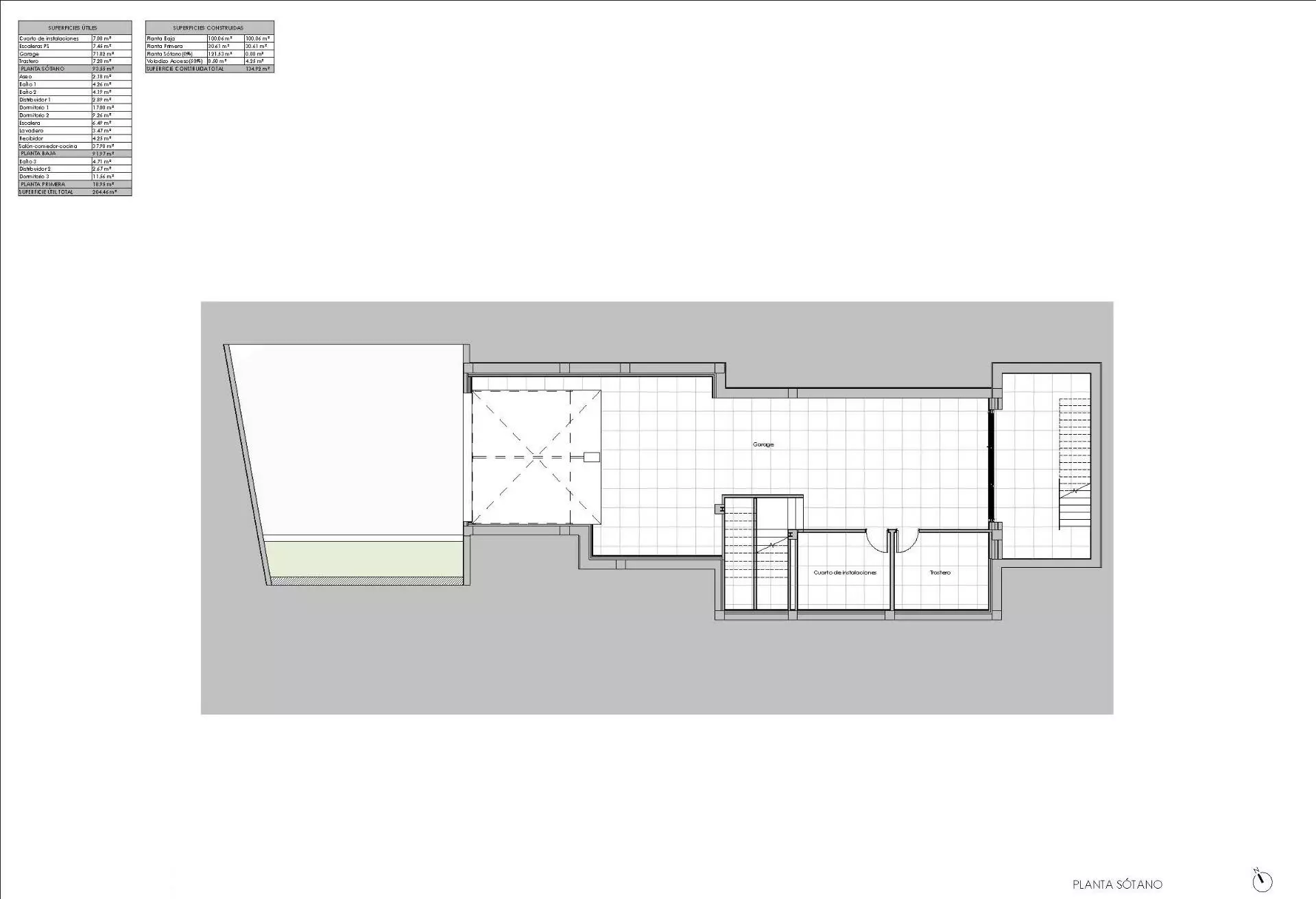 This villa features a practical design spread over two floors along with a basement. It includes three bedrooms, each equipped with its own ensuite bathroom, plus an additional guest toilet. The ground floor incorporates an open-plan kitchen that connects to the living area, two bedrooms, and leads to a large terrace with a private 60 square meter swimming pool and landscaped garden. The first floor hosts a private bedroom suite. The basement offers a spacious garage that accommodates two cars and benefits from natural light and ventilation through an English patio.