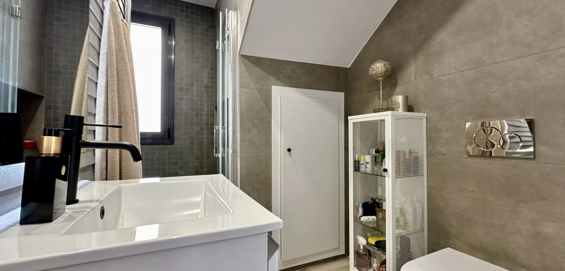 The villa provides ample living space, spanning two levels with 128 m² dedicated to the interiors. You will find an open-plan living and dining area that seamlessly connects to a fully equipped kitchen. This setup is ideal for both daily living and entertaining guests.