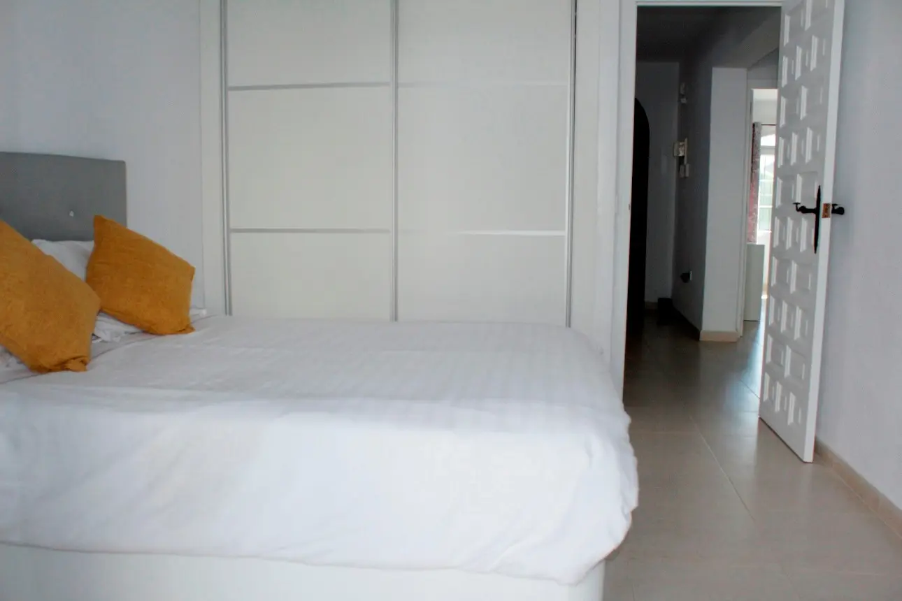 Inside, you will find three double bedrooms equipped with fitted wardrobes, as well as three bathrooms. One of the bathrooms is an en-suite that gives access to a covered terrace with views of the gardens and pool area. The ground floor includes a welcoming entrance and a spacious hallway, along with a guest bathroom featuring a shower. A separate kitchen is fully equipped for your cooking needs, while the lounge-dining area is illuminated by natural light, thanks to high vaulted ceilings and French doors leading to a sizable balcony.