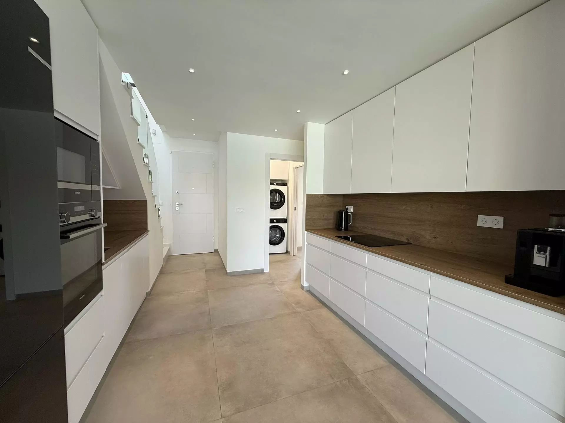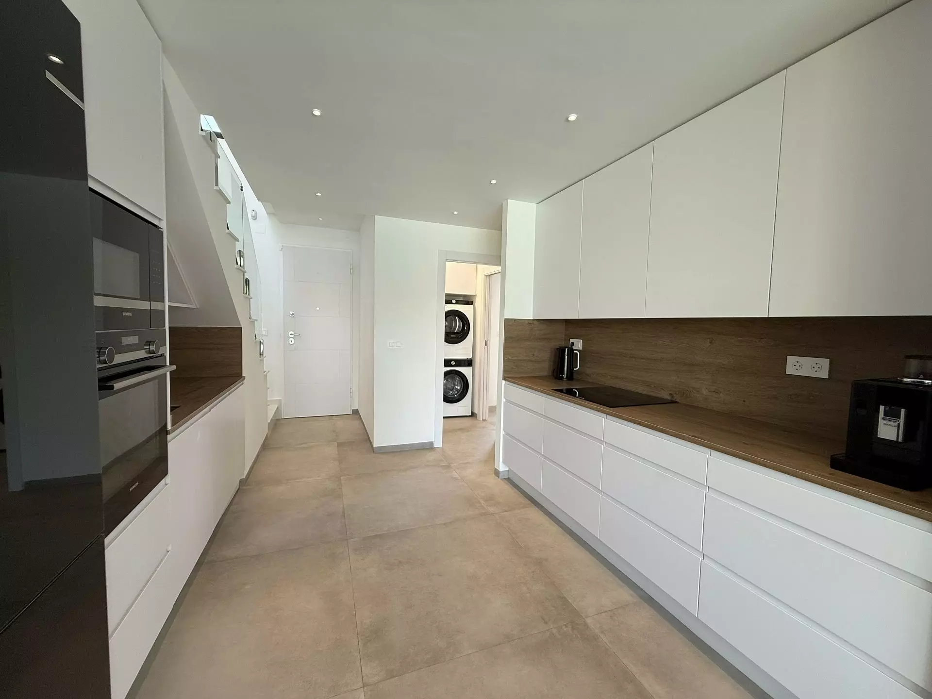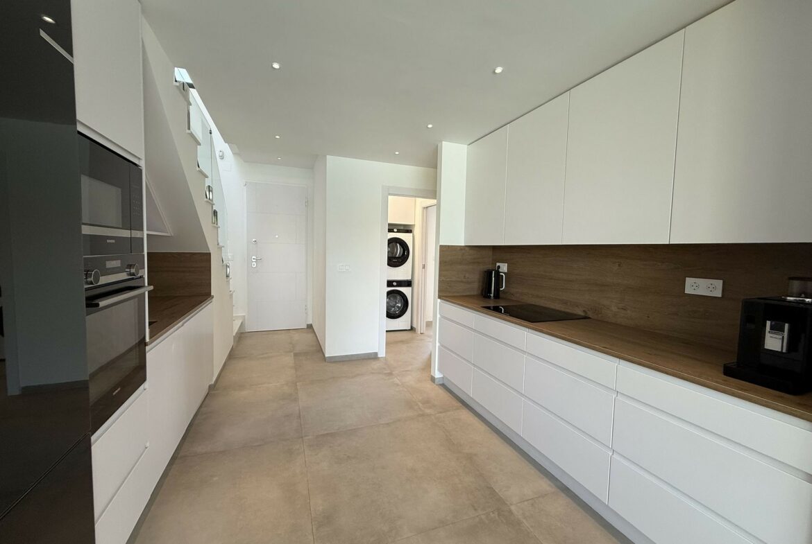 The villa encompasses four bedrooms and a living room, designed with practicality in mind. The layout invites natural light while maintaining a functional space for family life. Modern appliances are included in the kitchen, such as a Siemens oven and microwave, Bosch fridge and freezer, and AEG dishwasher, all set against a stone countertop with a wood-effect finish.