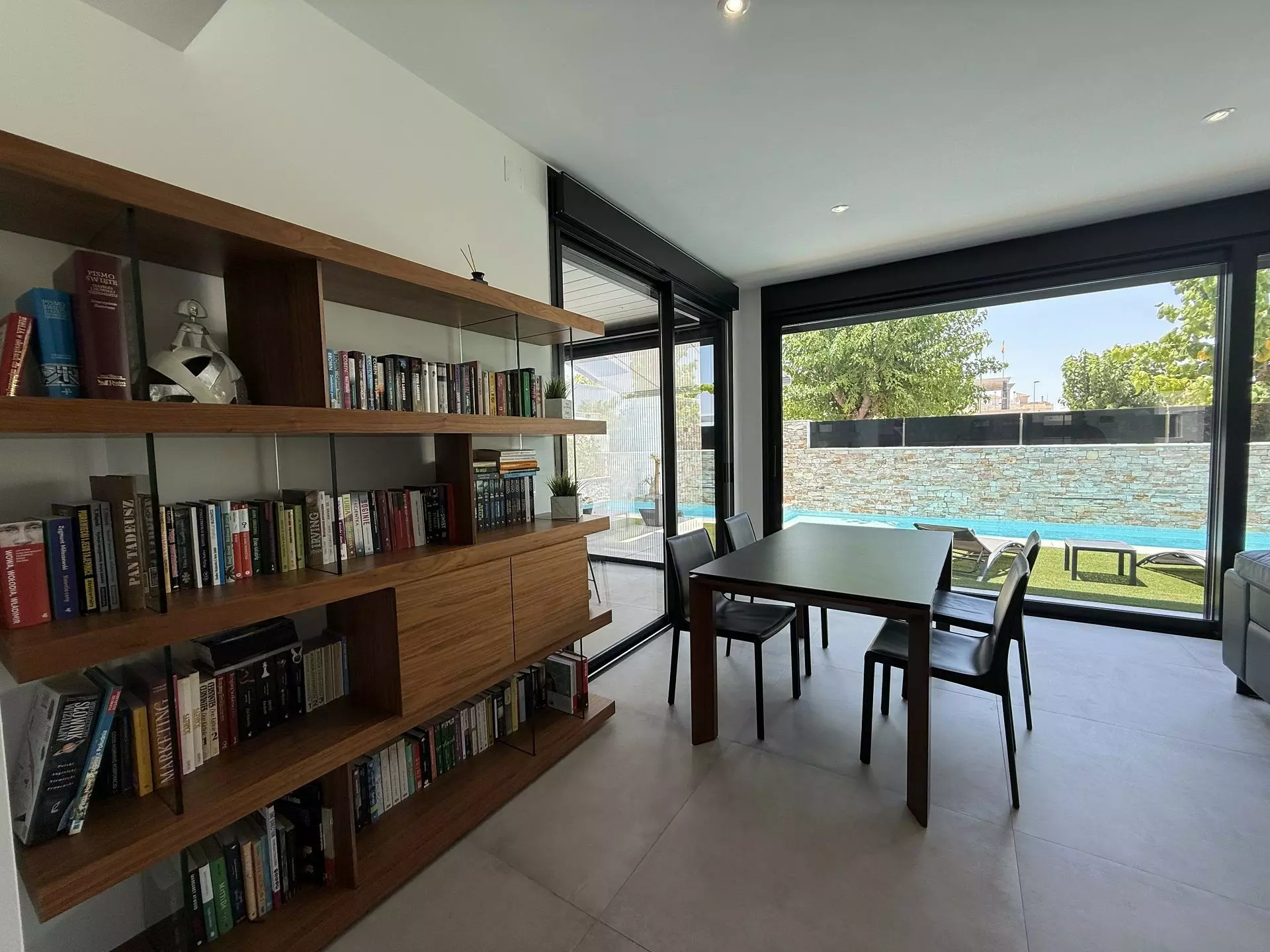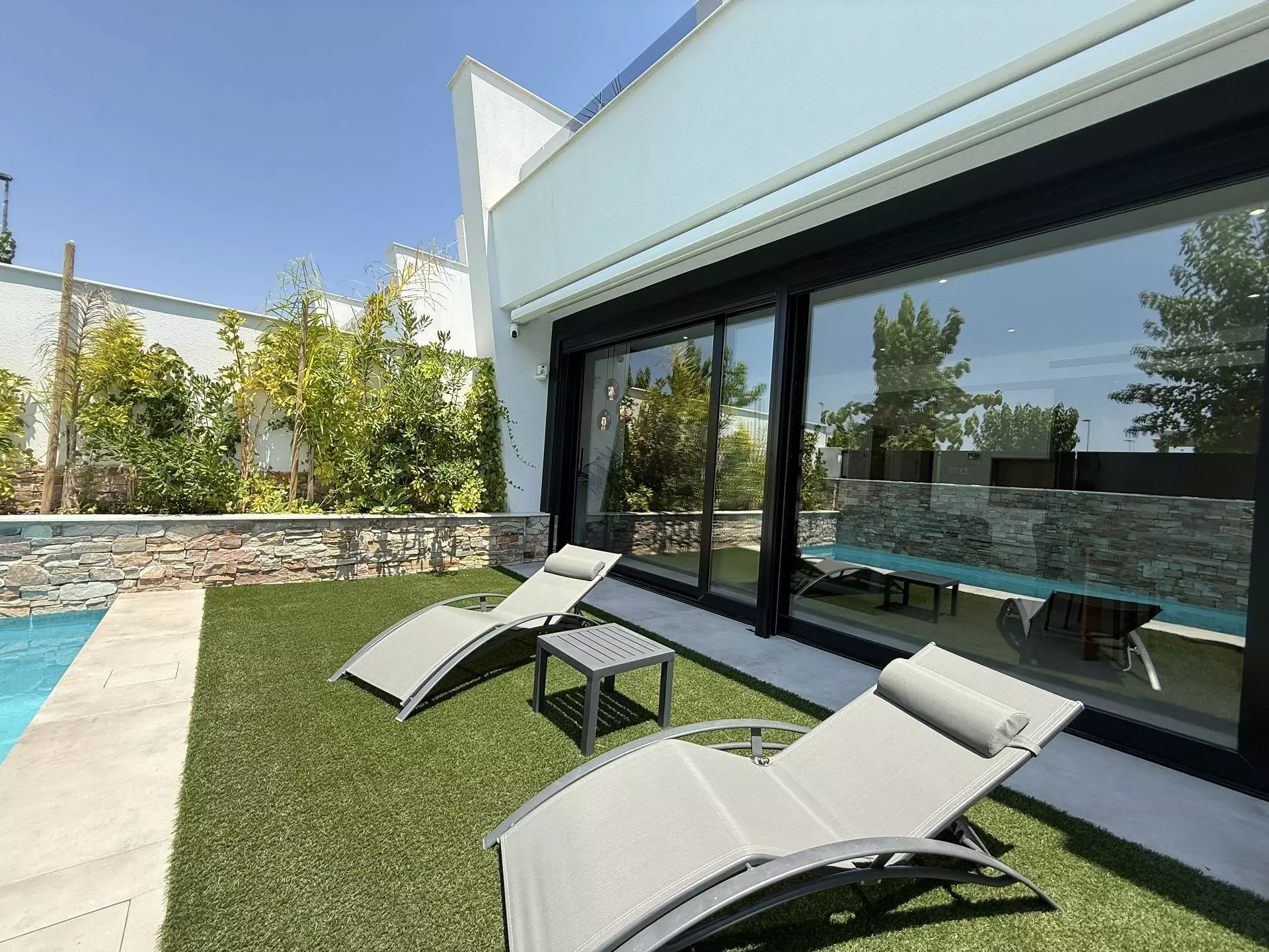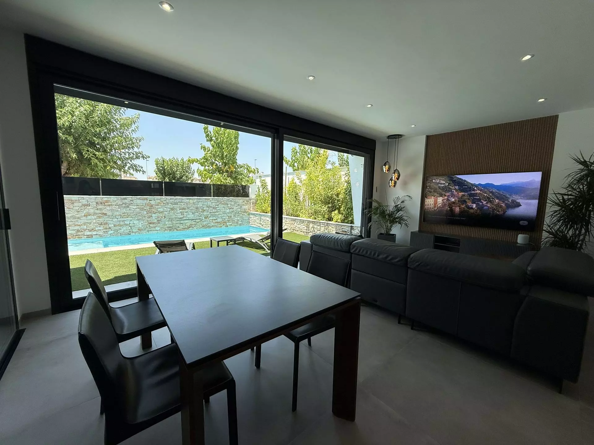 The villa encompasses four bedrooms and a living room, designed with practicality in mind. The layout invites natural light while maintaining a functional space for family life. Modern appliances are included in the kitchen, such as a Siemens oven and microwave, Bosch fridge and freezer, and AEG dishwasher, all set against a stone countertop with a wood-effect finish.