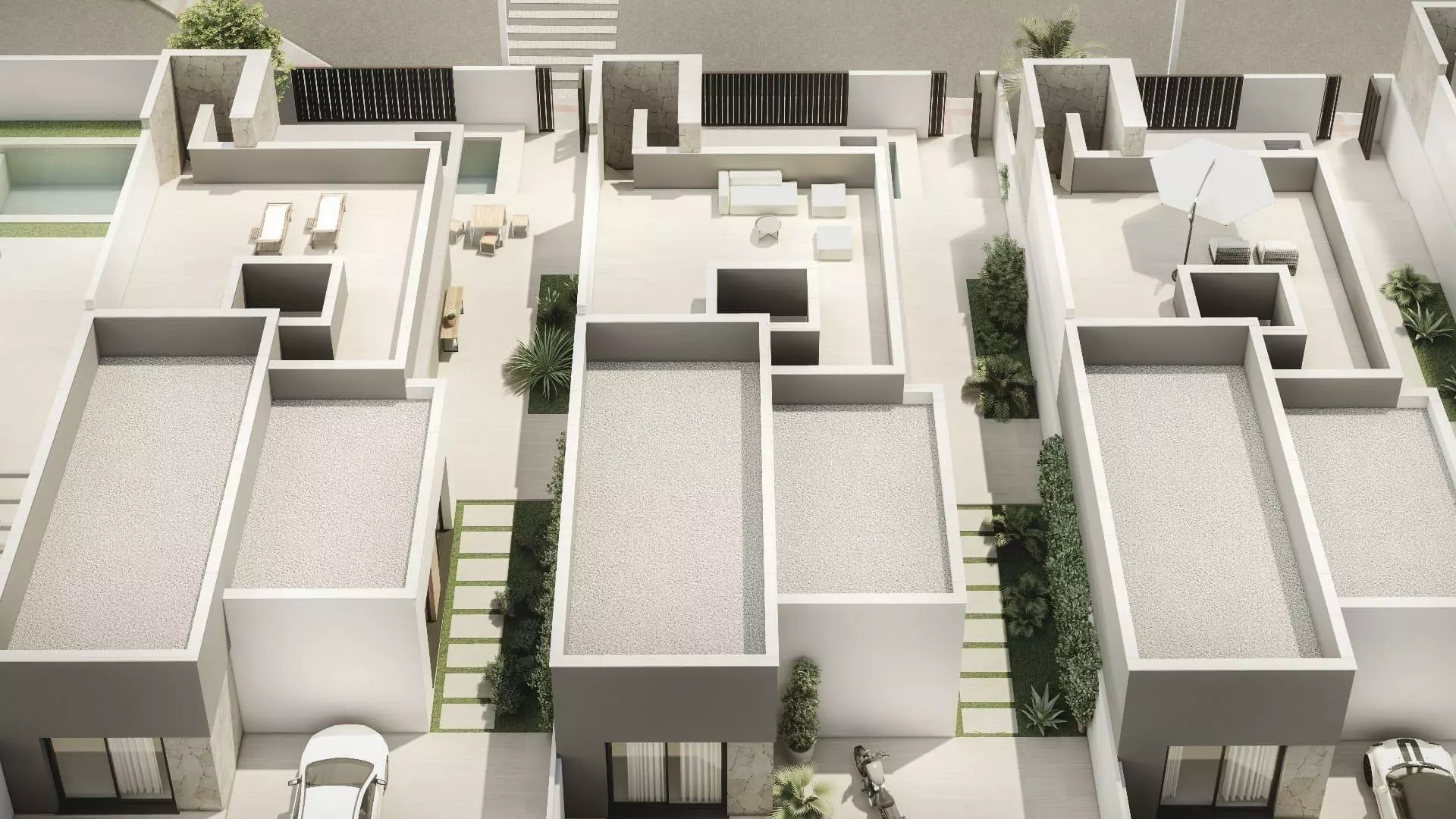 Each unit includes spacious terraces that are equipped with solid parapets, enhancing both safety and openness. The exterior of the plots mirrors the materials used for the homes, ensuring a blend within the residential community. Rooftops are ventilated and insulated, with finishes tailored to their specific utility, aiming for optimal weather resistance.