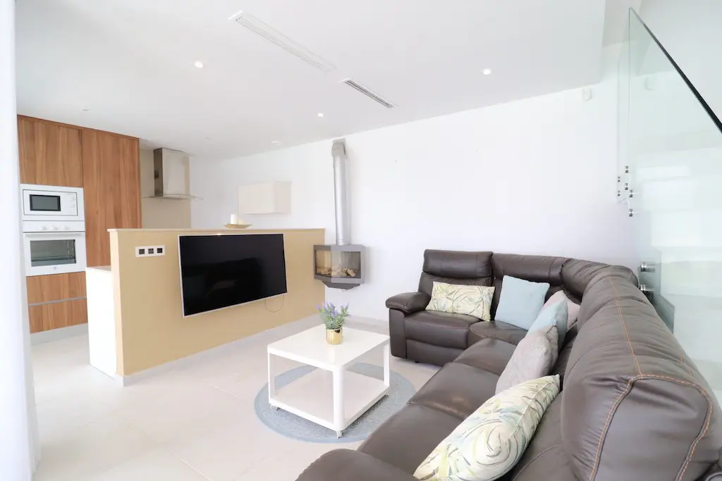 The villa features three bedrooms and three bathrooms, providing sufficient space for family living or accommodating guests. An open kitchen design supports easy navigation and utility, adjoining a large living room that includes a fireplace. This area promotes good airflow and interaction among occupants.