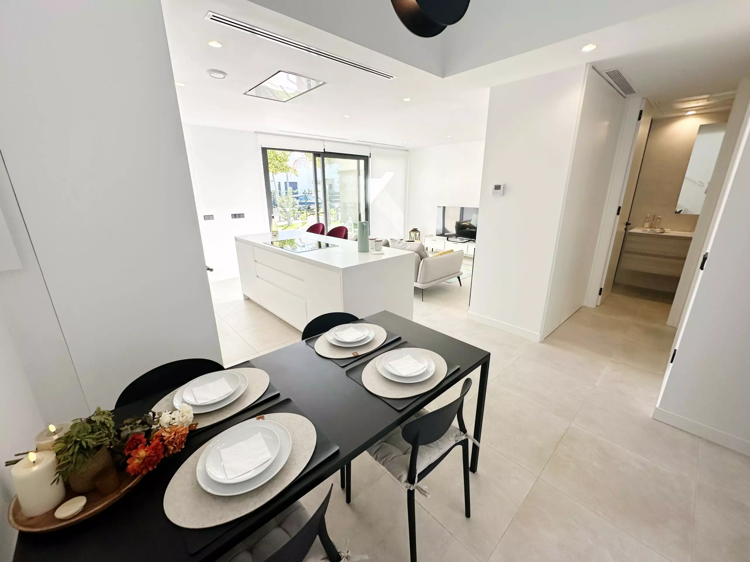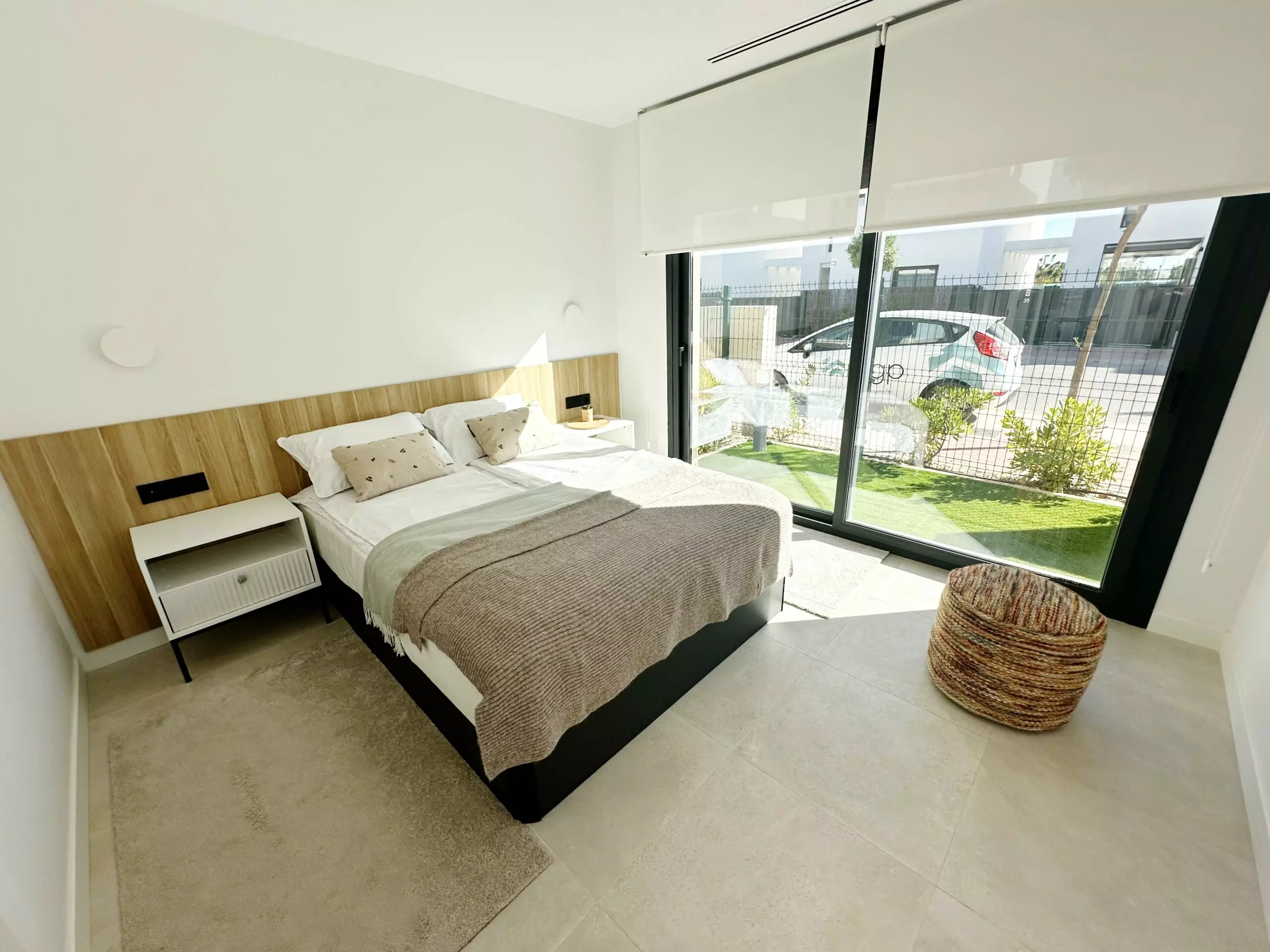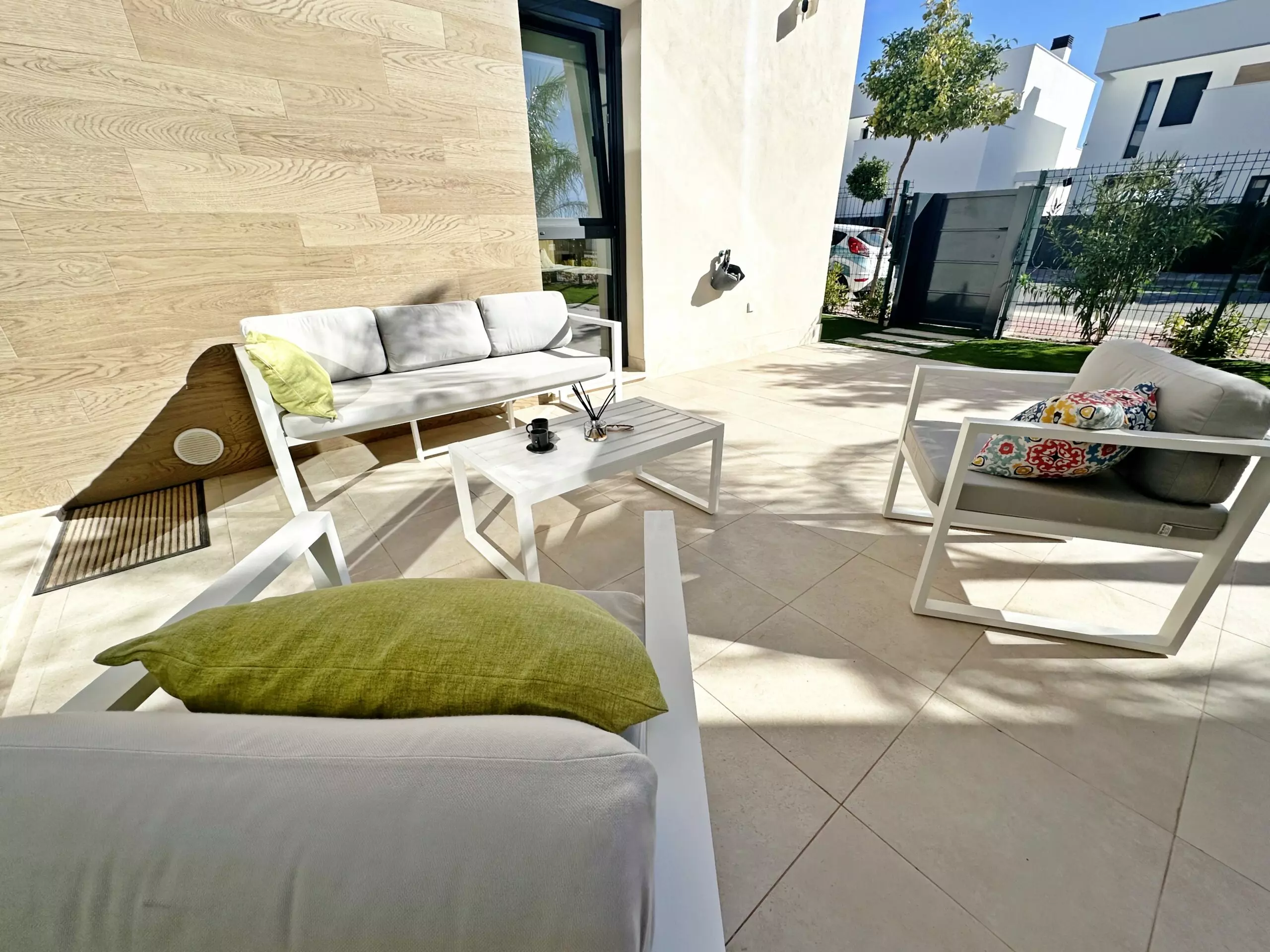 This beautifully designed villa features its own private driveway with convenient parking. There is the option to install a jacuzzi or swimming pool, allowing you to create a private outdoor relaxation area.The terrace adjoining the living room has been carefully designed to offer a peaceful, secluded space for relaxation. The villas themselves have been conceived with comfort, tranquillity and privacy in mind.Ideally located, the property is just a two-minute walk from the impressive lagoon and beach areas within Santa Rosalía Lake and Life Resort. The charming town of Los Alcázares and the beaches of the Mar Menor are only a five-minute drive away, offering a variety of popular Spanish restaurants such as Tropical and Encarnación.Inside, the home impresses with a wonderful sense of space and natural light – the dining area benefits from a double-height ceiling, while the lounge opens through large patio doors onto the terrace and garden. The modern kitchen includes a generous island with a breakfast bar and high-quality appliances. On this level there is also a practical utility room with a boiler and washing machine.The ground floor features a double bedroom with an en-suite bathroom and direct access to the garden, a second double bedroom with patio doors leading to the rear terrace, and a stylish family bathroom. The hallway also includes a useful built-in wardrobe providing additional storage space.Upstairs, the master bedroom offers a walk-in wardrobe, an en-suite bathroom and its own private terrace. From this floor there is access to a spacious south-facing terrace, shared between the master suite and the hallway.The villa is equipped with a solar installation for domestic hot water and 5 kW photovoltaic panels, significantly reducing energy costs. The Airzone system allows independent temperature control in each room – for both heating and cooling – ensuring year-round comfort.The kitchen features an elegant island finished with premium Porcelanosa – Krion worktop, made of a modern, durable and hygienic material inspired by natural stone. This worktop was added as an additional feature at the owners’ request.The interior has been carefully arranged with attention to material consistency and fine details. Wall-mounted lights in the bedrooms and the living-room pendant lamp were added at the owners’ request, reflecting a modern Spanish style with a subtly raw, stone-inspired character – resulting in a balanced and elegant atmosphere throughout.The property is sold fully furnished, has an A-class energy rating, Airzone climate control, an outdoor shower in the garden, and the option for quick completion – with no need to wait for a new construction phase.