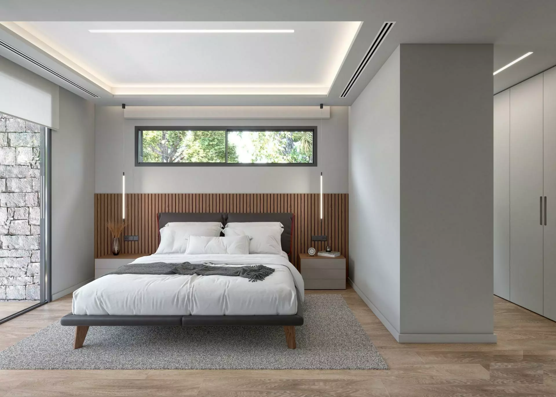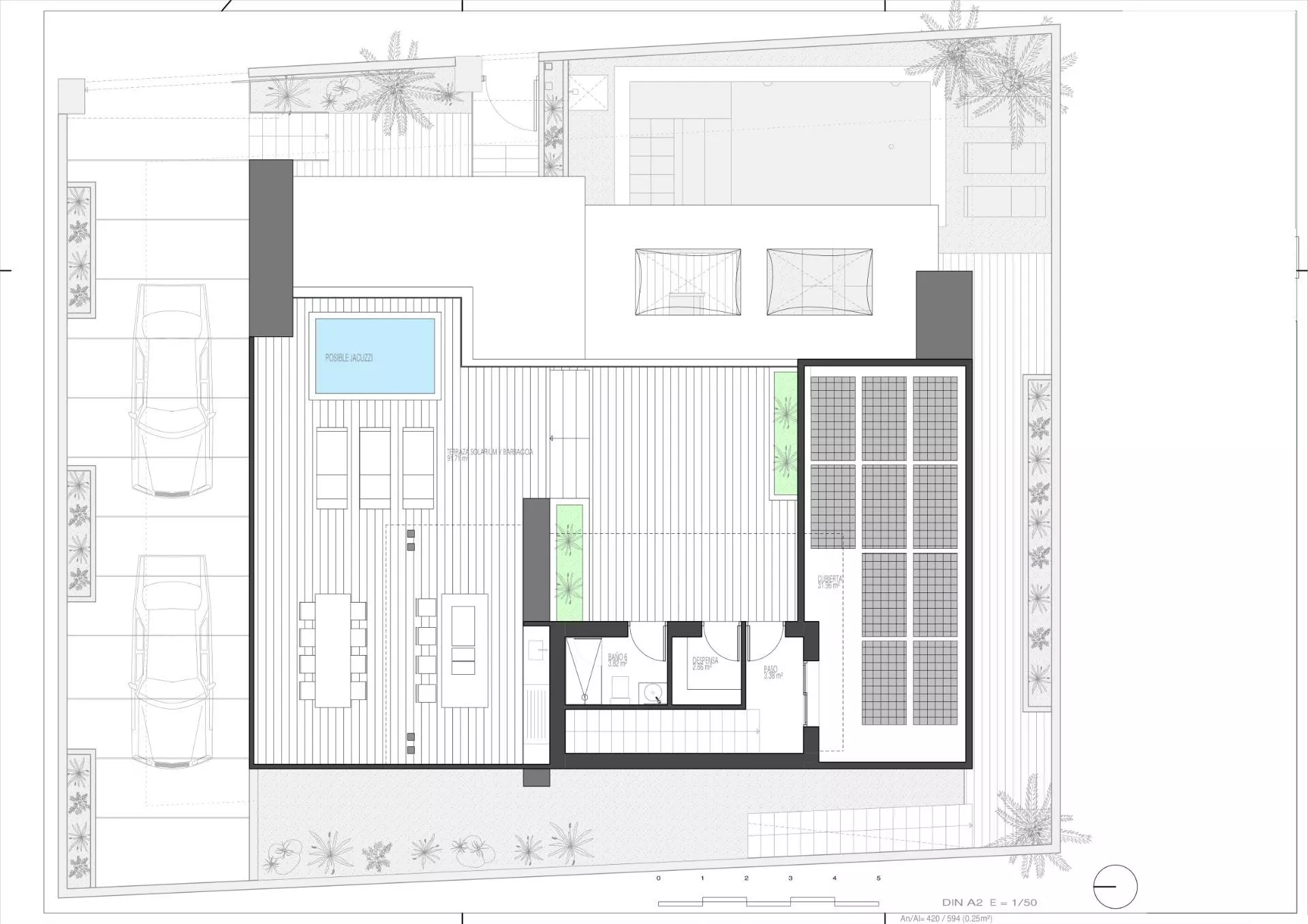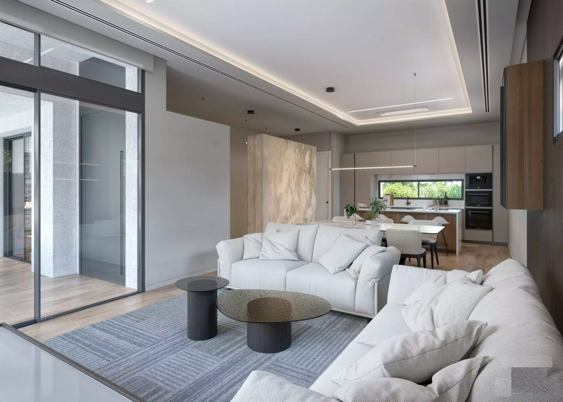 This development features 15 independent villas, each comprising three bedrooms and three bathrooms, plus a guest toilet. The layout includes a large living room and kitchen area characterized by a double-height ceiling. It also includes a terrace with a pool and a private solarium designed with pre-installation for a jacuzzi, as well as a basement.