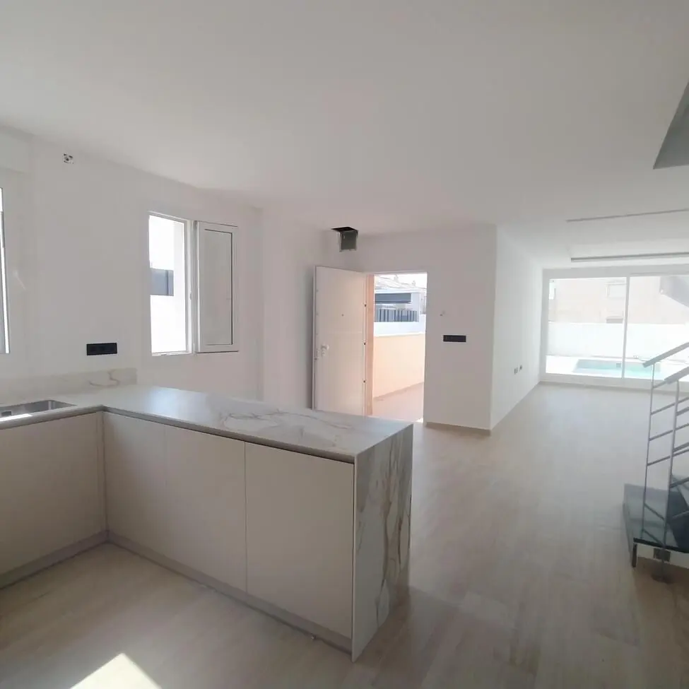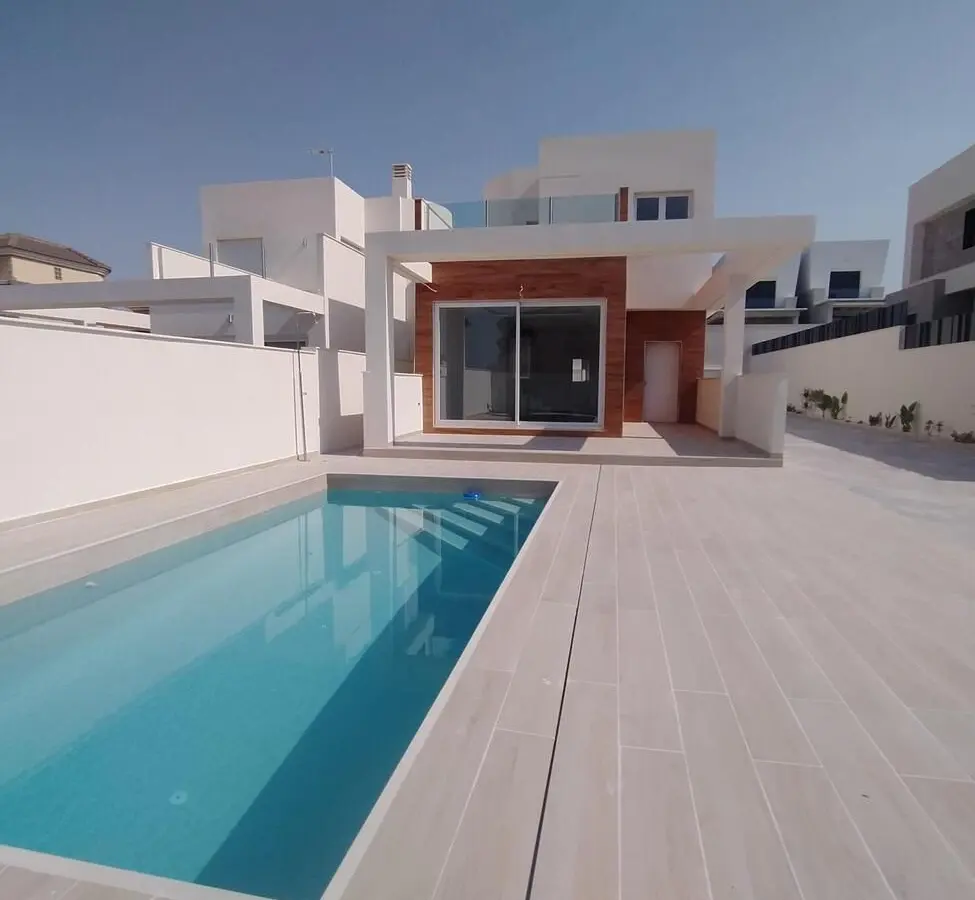 Detached villa for sale with 239 m2 of built area and a 407 m2 plot. It has 3 bedrooms and 2 bathrooms, a French-style kitchen, a laundry room, 2 sunrooms, a large garden, a patio, a porch, and a beautiful private pool. On the ground floor, there is a spacious living room overlooking the pool, a French-style kitchen open to the living room, 2 bedrooms, 1 full bathroom with a window, and the staircase leading to the 1st floor. There is also a large bedroom with a dressing room, a full en-suite bathroom, and access to the sunroom. A room for the water heater and washing machine, with access to another sunroom. Security door, aluminum frames with double-glazed windows. South-facing on the main facade and north-facing on the back. NO NEIGHBORHOOD COMMUNITY NO PROPERTY TAX/HOUSE SUM.