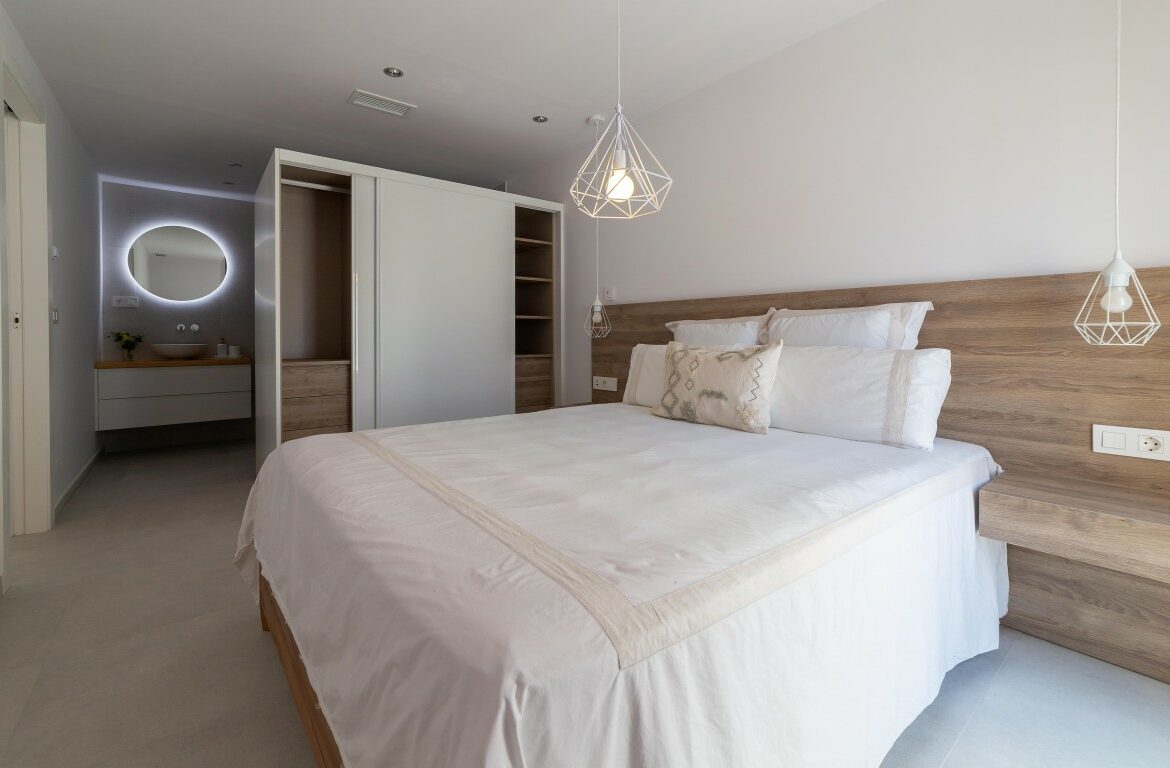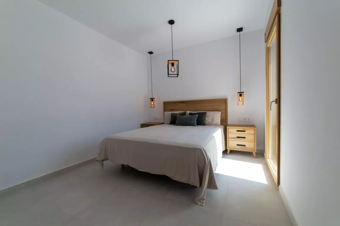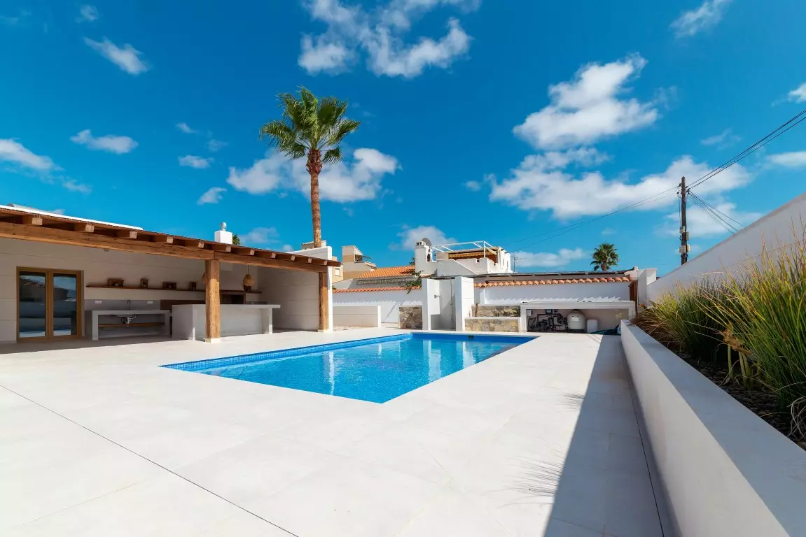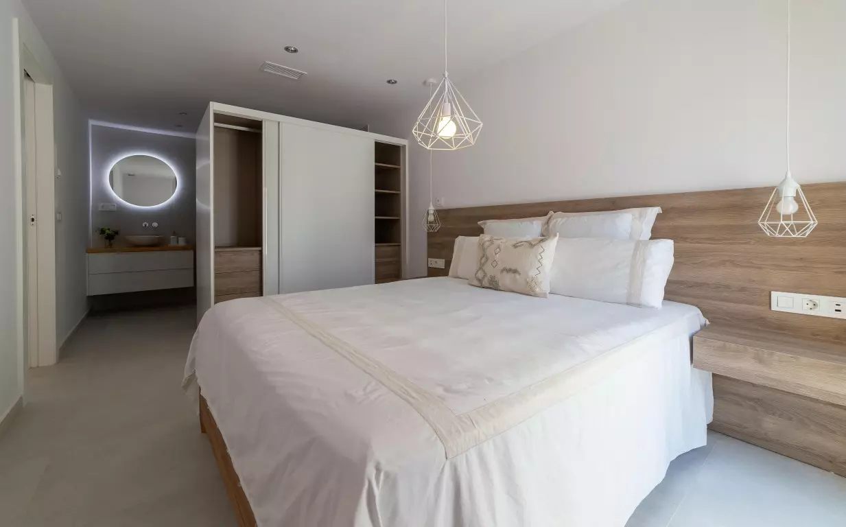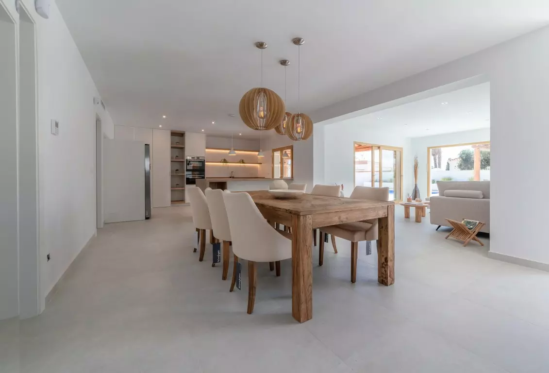 This Ibiza-style villa features four bedrooms and three bathrooms, spanning 190 square meters on an 800 square meter plot. Located near the Salinas, this fully renovated property encapsulates the essence of the popular Ibiza design with its white plastered walls, organic shapes, and elements of wood and natural stone.