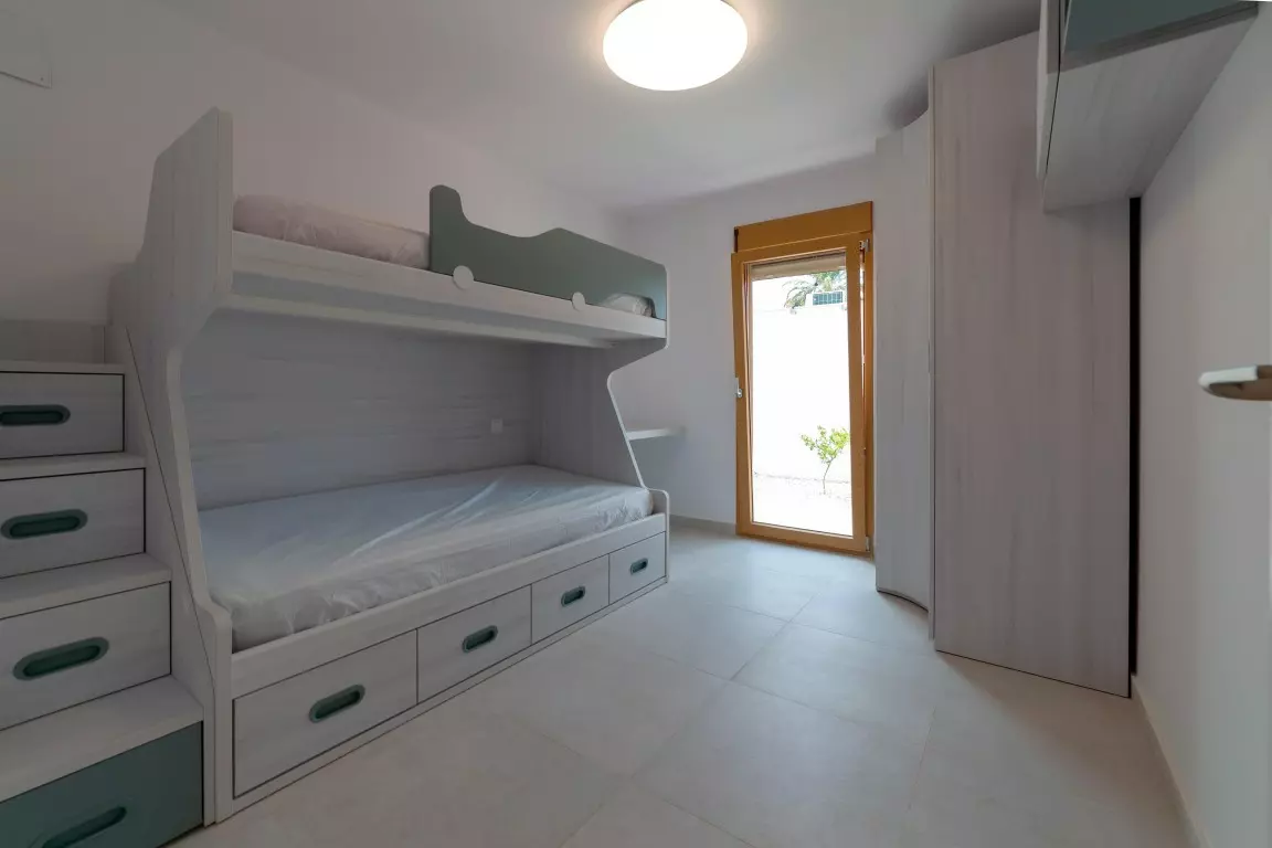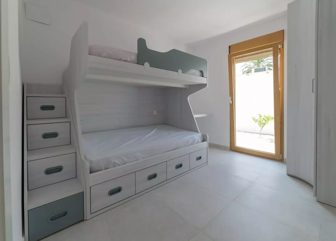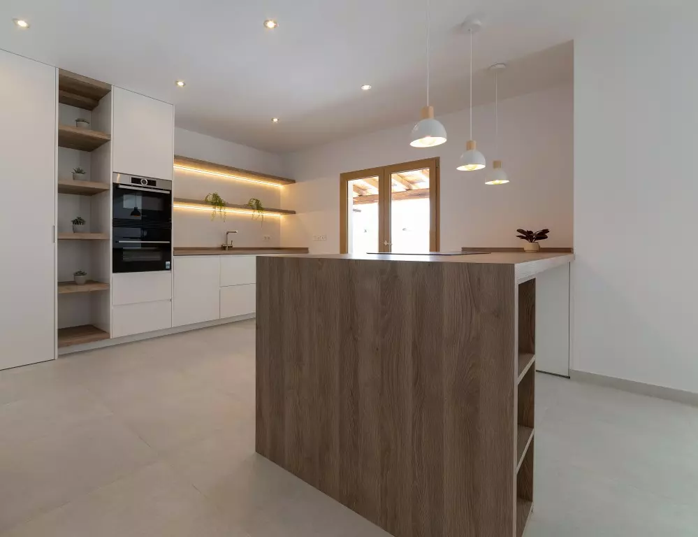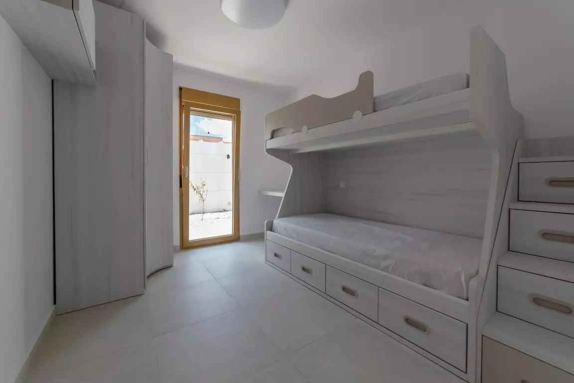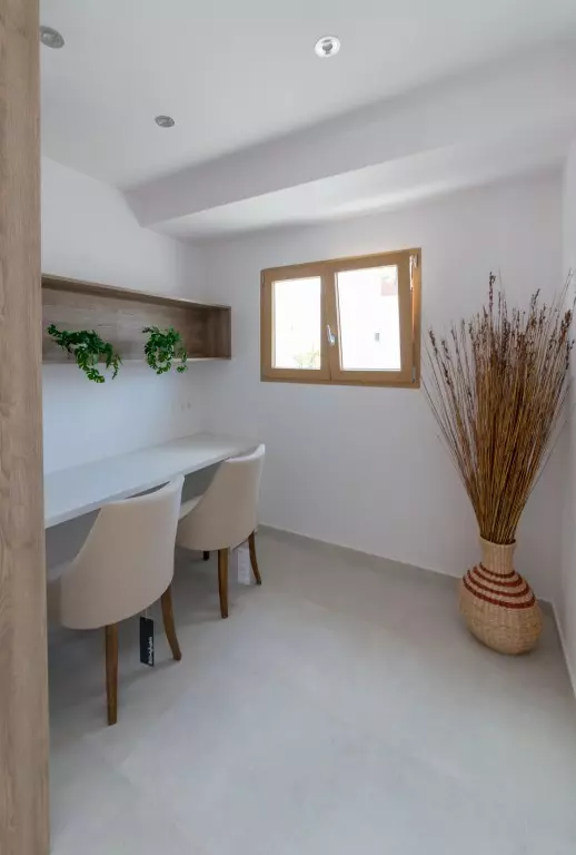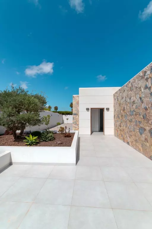 This Ibiza-style villa features four bedrooms and three bathrooms, spanning 190 square meters on an 800 square meter plot. Located near the Salinas, this fully renovated property encapsulates the essence of the popular Ibiza design with its white plastered walls, organic shapes, and elements of wood and natural stone.