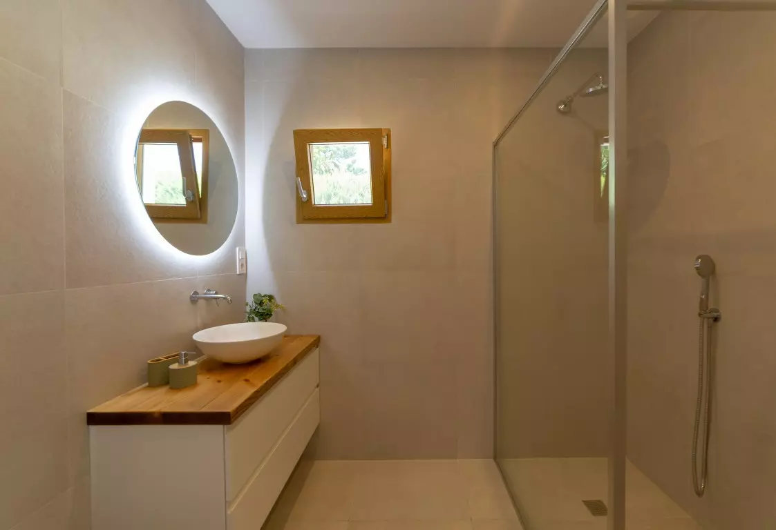 The living room provides direct access to a large terrace adjacent to the swimming pool. This terrace is partially covered by a pergola, creating a shaded space for relaxation. The pool terrace includes a summer kitchen that serves as an ideal spot for enjoying long summer evenings with family and friends while having snacks and drinks.