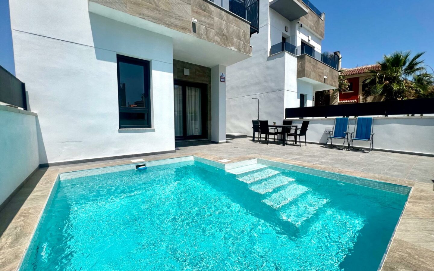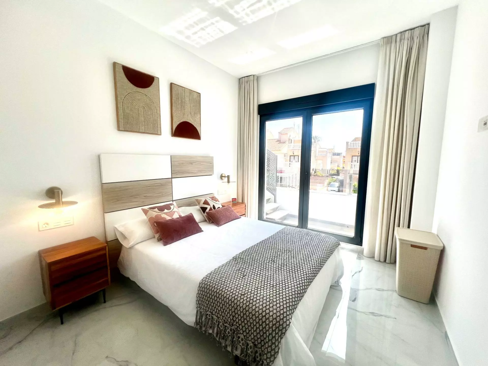 On the upper level, you will find two additional bedrooms, each equipped with its own en-suite bathroom. This design creates a level of privacy for the occupants, making it suitable for families or guests. Additionally, there is direct access to a solarium, where views of Torrevieja’s notable pink salt lake can be enjoyed—this feature adds a unique aspect to the overall appeal of the property.