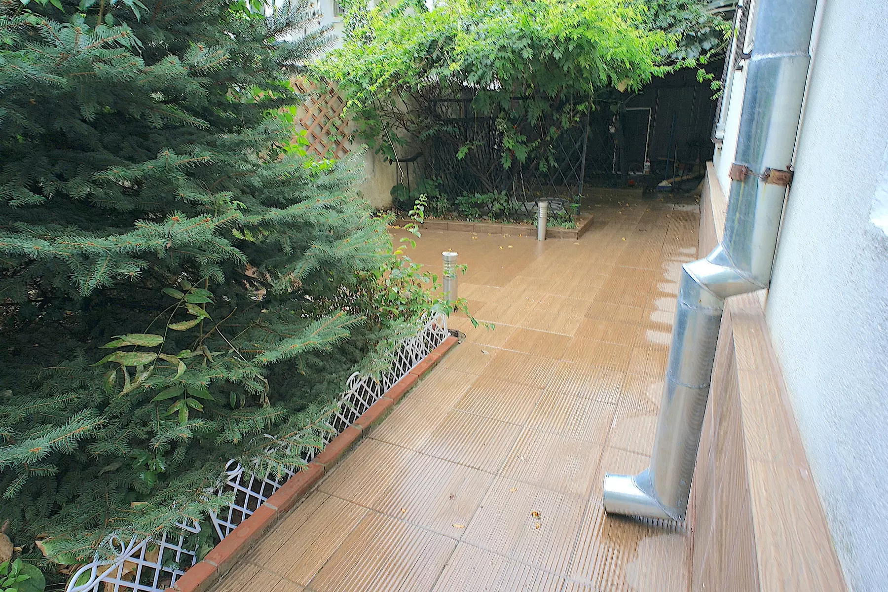 The property includes a free yard measuring approximately 85 square meters. This outdoor space is arranged with flowers and ornamental trees, offering a pleasant environment. The yard is divided into sections on the front and left sides of the villa.