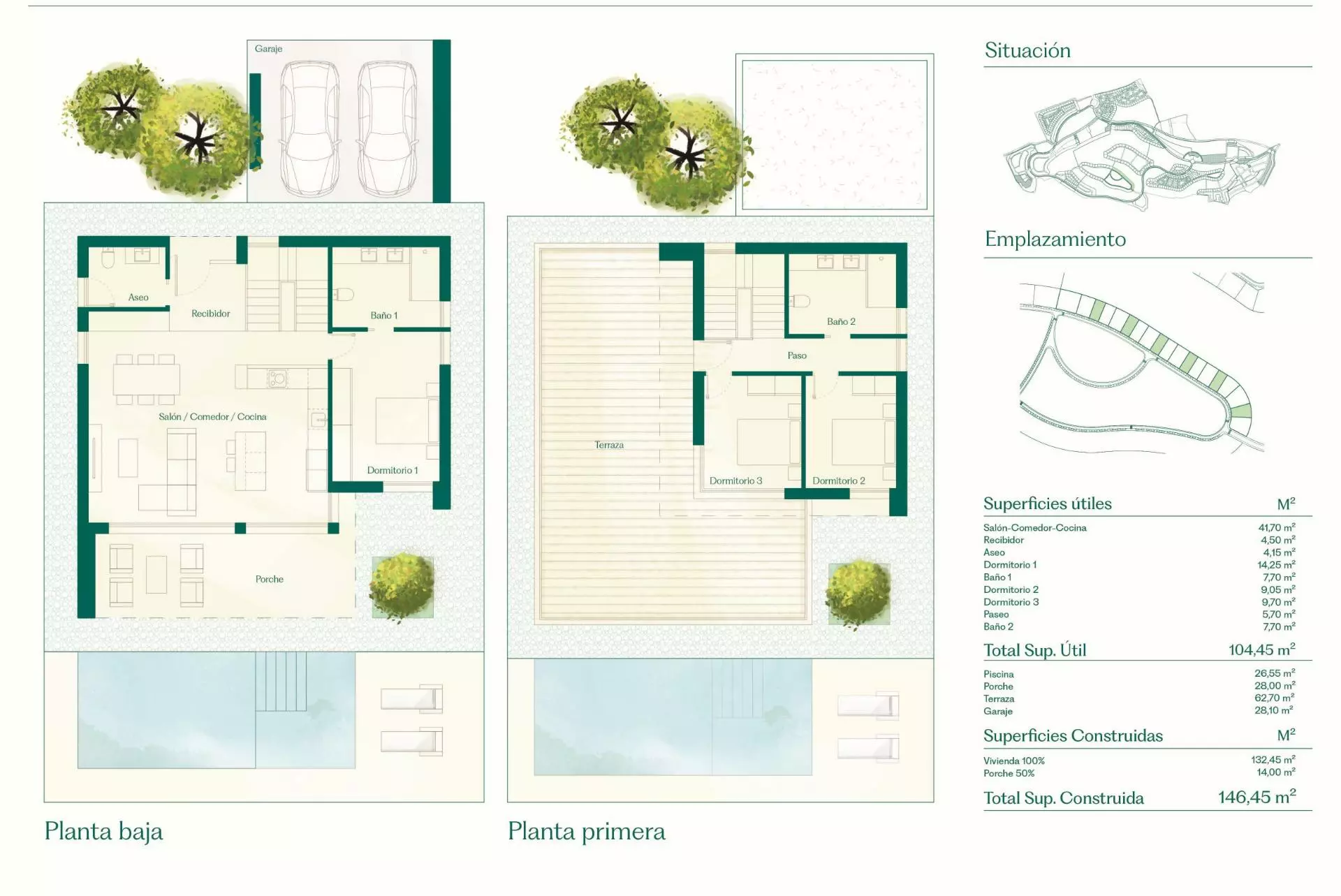 These contemporary villas are designed to prioritize comfort and privacy while being integrated into an exceptional golf and leisure environment. Each property boasts a spacious layout featuring 3 bedrooms, 2 bathrooms, and an additional guest toilet. Depending on the model, you have the options of a single or double-level design.