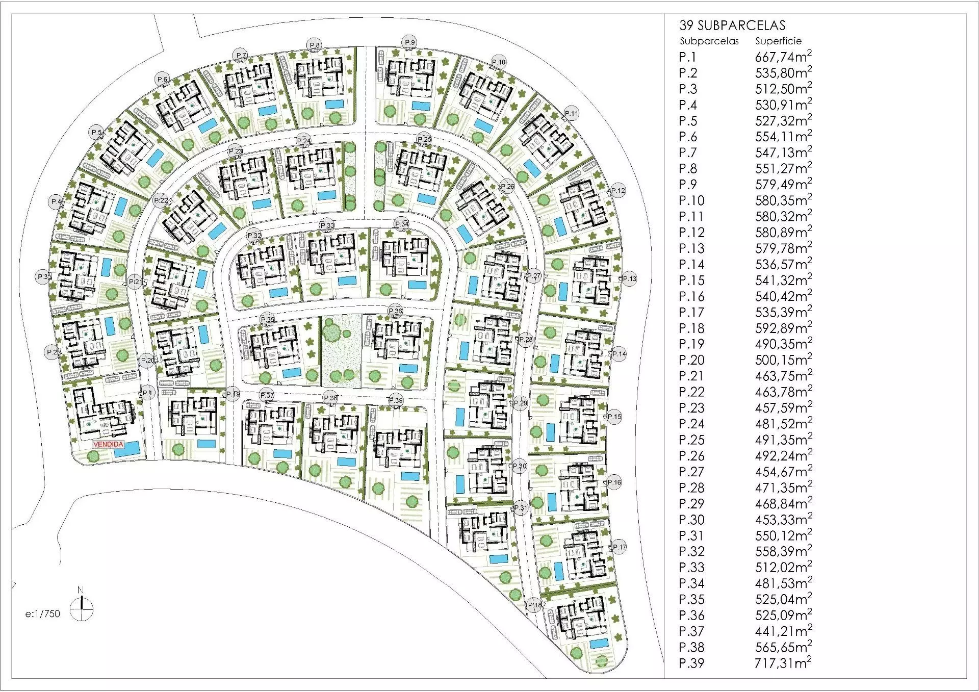 The residential complex comprises 39 villas, each situated on plots starting at 436 m². Each villa features three bedrooms and two full bathrooms, all conveniently located on one level. Additionally, residents can enjoy a terrace area that includes a private pool and a rooftop solarium, providing views of the golf course.
