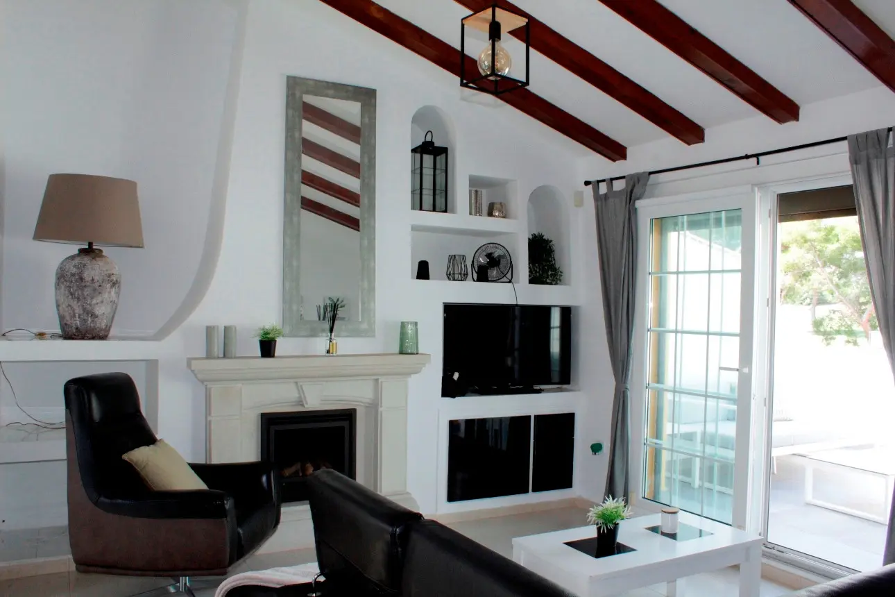 The villa includes three double bedrooms, each equipped with fitted wardrobes, and three bathrooms. One of the bathrooms is an en-suite that opens directly to a covered terrace, offering views of the gardens and pool area. Entering the ground floor, visitors will find a welcoming entrance that leads to a covered terrace, alongside a spacious hallway. A guest bathroom with a shower, a separate fully equipped kitchen, and a bright lounge-dining area with high vaulted ceilings and a fireplace are also present. French doors from the lounge open onto a large balcony that features views over the surroundings. There are external stairs that lead to a roof solarium, which serves as an ideal spot for sunbathing and viewing the area.