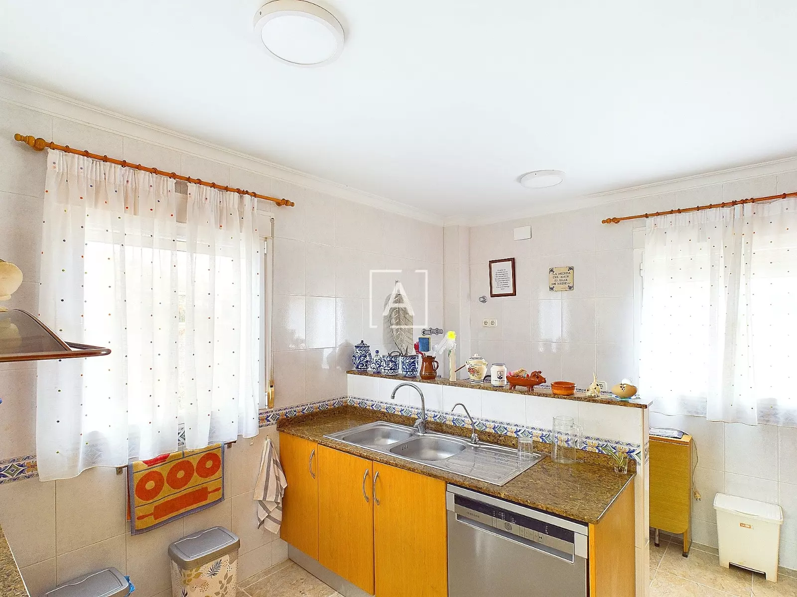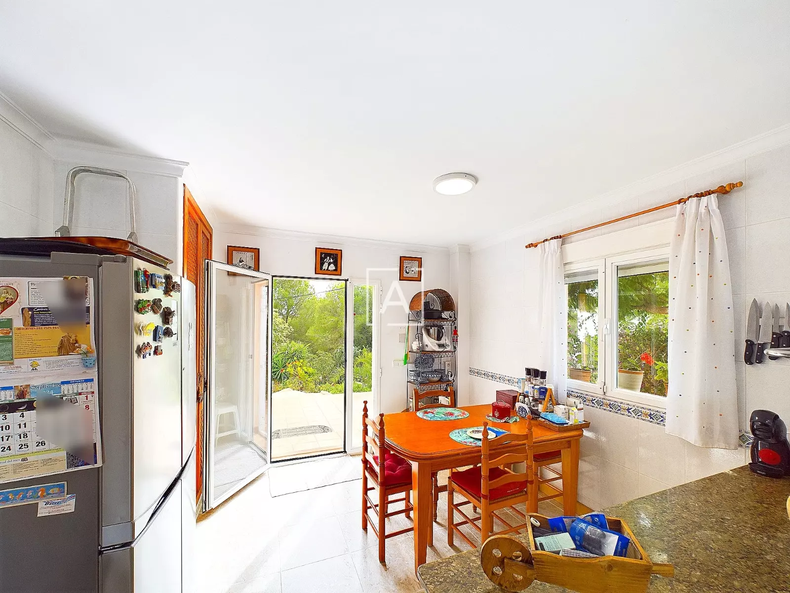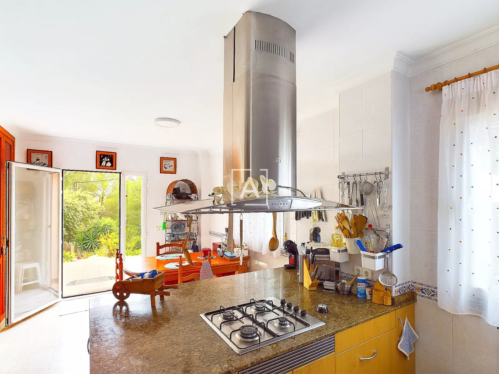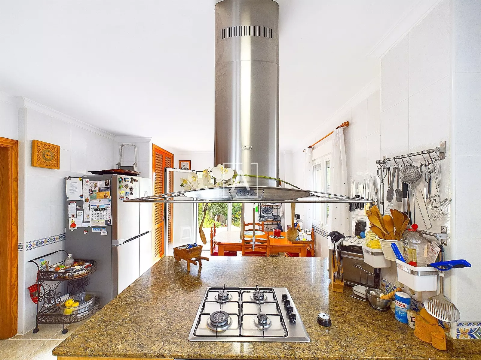 The main living area includes a high vaulted living and dining section. This area offers direct access to a large covered raised terrace. From here, views of the surrounding gardens and pine forests can be enjoyed. The family kitchen is equipped with a breakfast bar and cooking island, along with a laundry area. It offers space for dining and has doors that open onto the expansive terrace, which is suitable for outdoor cooking with a BBQ setup.