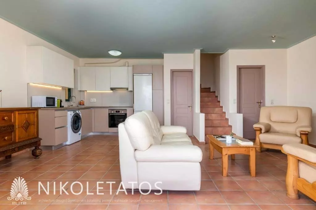 The villa spans two levels that facilitate a functional living arrangement. On the upper floor, there are two bedrooms, each providing expansive views of the sea right from the balcony. Adjacent to these rooms is a bathroom, effectively serving the needs of both spaces. Moving to the ground floor through an internal staircase, you will find an open-plan area designed for modern living.