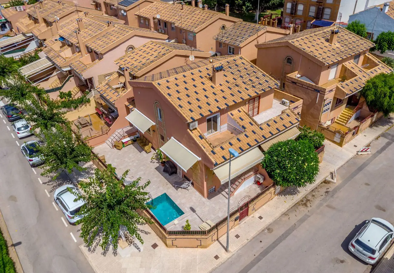 Spacious triplex with terrace/garden, located in an open and sunny position in the Torre de la Horadada area. Bedrooms: 3 Bathrooms: 3 Constructed area: 130 m2 Charming three-level corner terraced property with three bedrooms, three bathrooms, a private closed garage, and a private splash pool. Welcome to this corner triplex in the heart of Torre de la Horadada. This home offers generous space both as a holiday home and for year-round living, featuring a pleasant paved sunny garden that allows you to enjoy the sun by the pool or dine al fresco. Combining modern design with high-quality features, this triplex is ideal for those seeking a property with spacious rooms. The property is within walking distance of some of the best beaches in the area and all essential services, including restaurants, shops, a pharmacy, and a supermarket. This carefully designed home features an open-plan living and dining area connected to a fully equipped modern kitchen with Bosch/Siemens appliances, two fridge/freezers, and ample storage solutions. Adjacent to the kitchen is a practical utility room/home office with space for a washing machine and storage, and with direct access to the garden. The property offers three spacious bedrooms, all with built-in wardrobes. The master bedroom provides direct access to a private balcony, offering additional space for relaxation. All three bathrooms are modern. From the living room, there is access to a paved garden with three awnings, perfect for providing shade on hot days (two of them electric). The highlight of the property is undoubtedly the spaciousness of the rooms and the abundance of practical storage space. Relax in the lounge area or sunbathe on the sunbeds around the pool. Many extras, such as: Individually controlled hot/cold air conditioning Ceiling fans Gas central heating and gas for hot water Low community fee: only €100/year Private garage The popular La Zenia Boulevard shopping centre, offering a wide variety of shops and entertainment options, is just a short distance away. The area’s stunning beaches and golf courses are only a few minutes’ drive away.