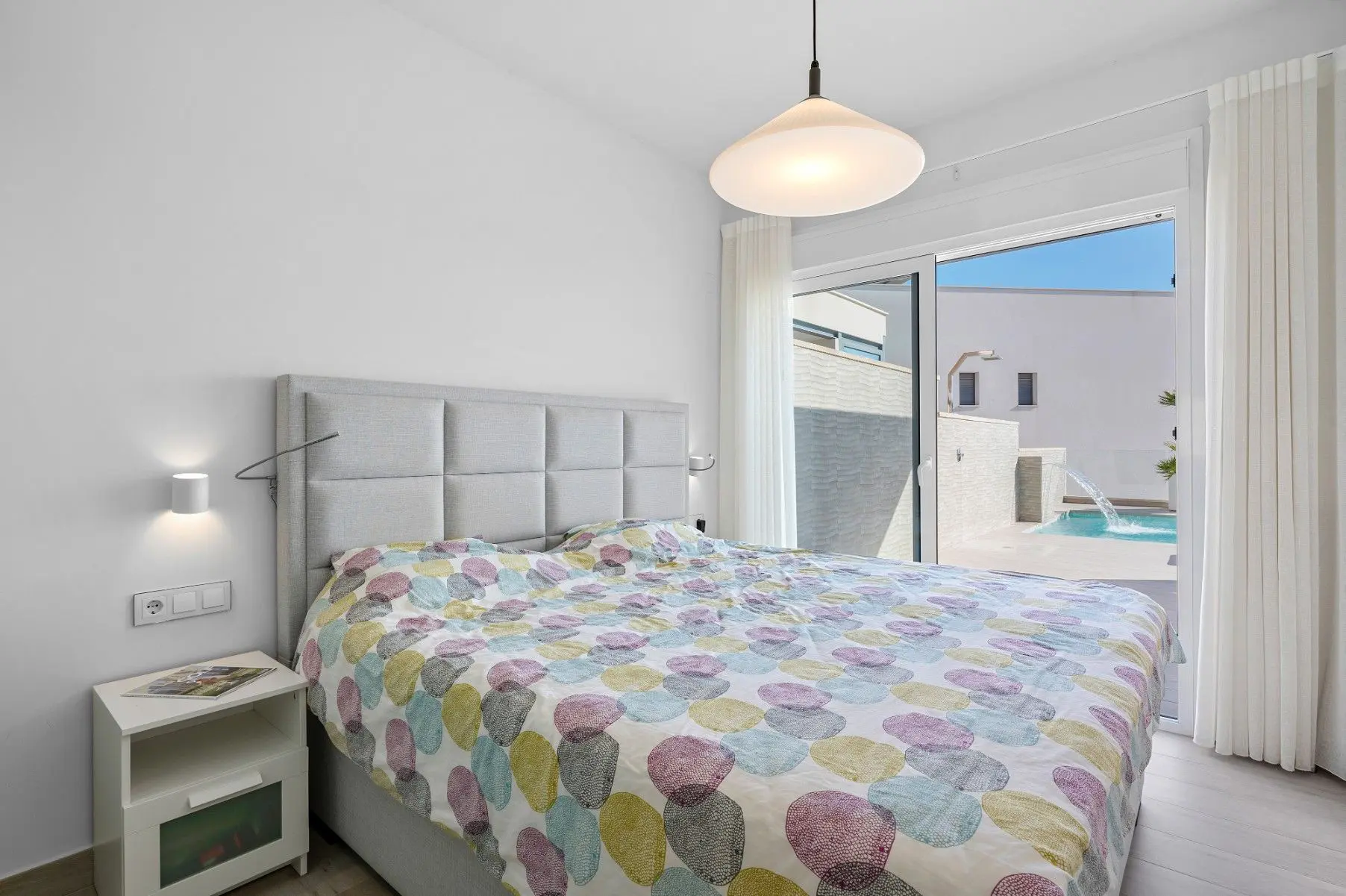 This modern villa, built in 2018, features 3 bedrooms and 2 bathrooms and is located in the heart of the Costa Blanca South. The property sits on a spacious plot and was designed with a strong focus on comfort and enjoyment. Outside, a private swimming pool offers the perfect place to cool off on warm days, while the spacious solarium with a fully equipped outdoor kitchen is ideal for spending long summer evenings with family and friends. From here, you can also enjoy breathtaking views of the sea and the salt lake. Practicality has also been well considered. The private plot provides secure parking for two cars, and thanks to the solar panels on the roof, the villa is energy-efficient with an EPC rating of B. This ensures not only comfort but also lower energy costs and sustainable living under the Spanish sun. The location is a major asset. Just a few minutes’ drive away you will find the centre of San Miguel de Salinas, the exclusive golf courses of Las Colinas, and a selection of beautiful beaches such as La Zenia, Mil Palmeras, and Cabo Roig. The neighbourhood is pleasant and international, with schools, shops, and the popular La Zenia Boulevard nearby, as well as scenic walking and cycling routes. The property is sold fully furnished and is ready to move into. Extras such as underfloor heating in the bathrooms and built-in storage in every bedroom provide that extra touch of comfort.