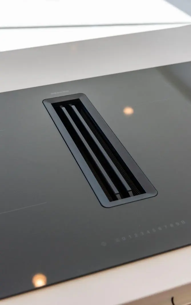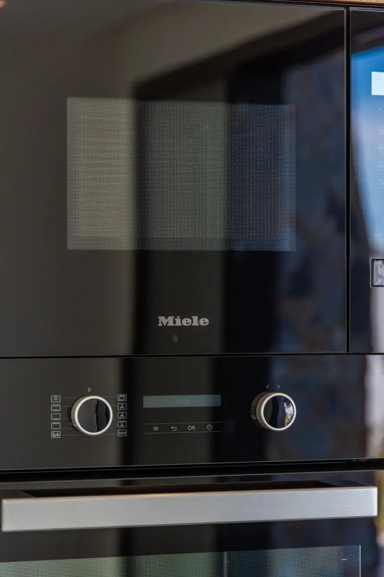 Fully furnished kitchen in white gloss or wood colour includes Induction hob with integrated extractor, oven, microwave, washing machine, integrated refrigerator, and integrated dishwasher.