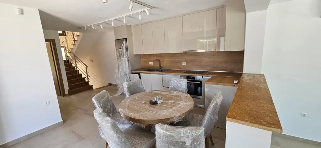 On the ground floor, you will find another bedroom, a living room that seamlessly integrates with the kitchen, as well as a shower WC. This open-concept design allows for easy movement and accessibility throughout the space.