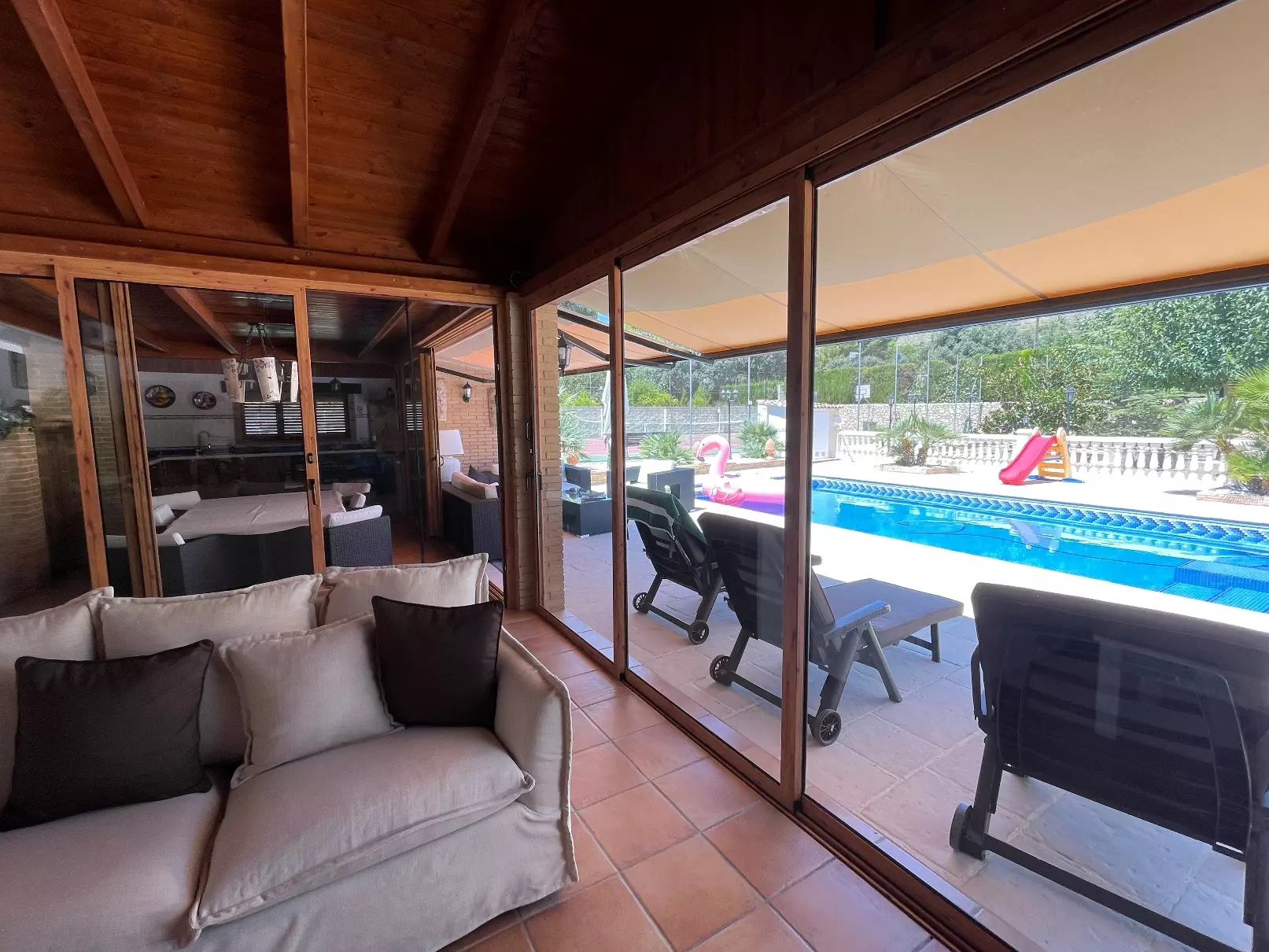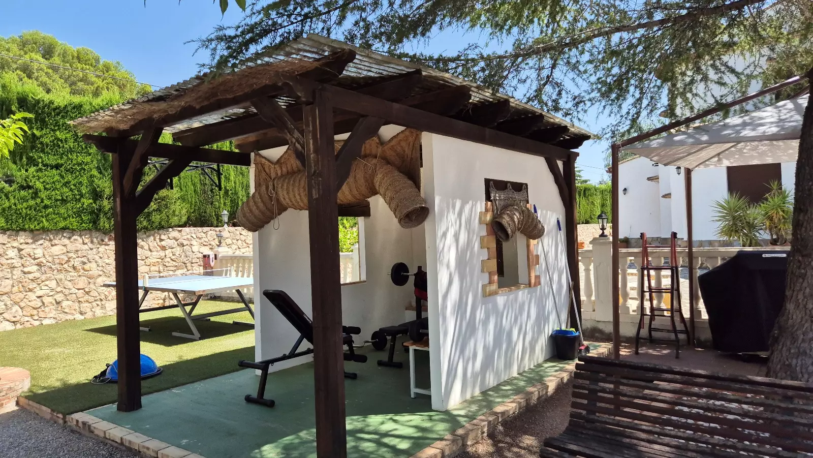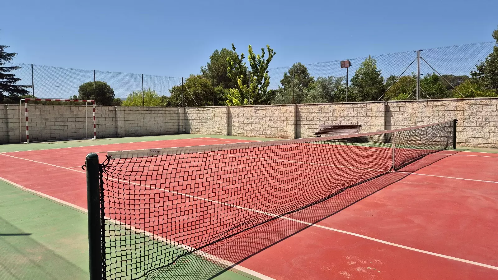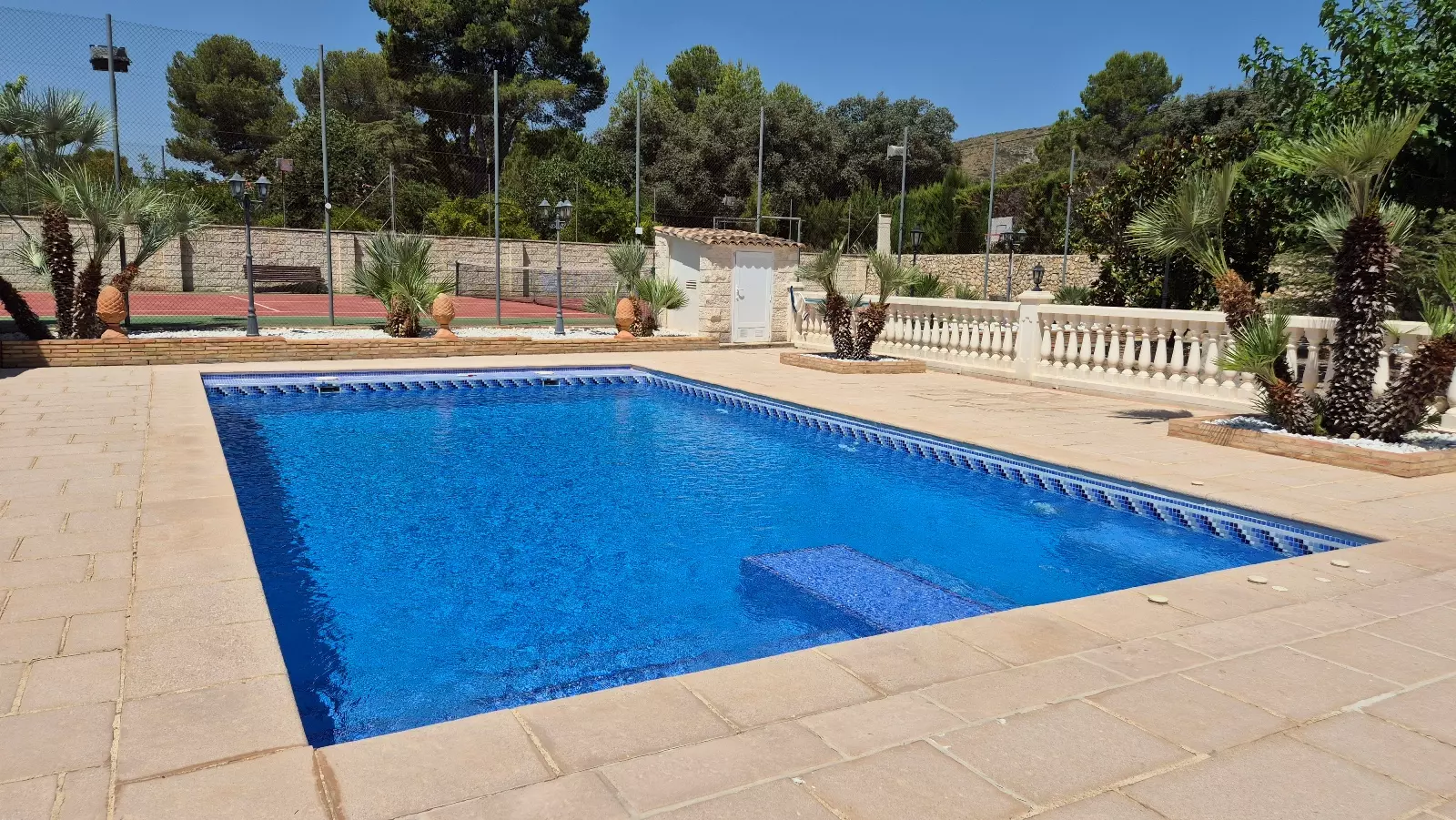 The outdoor space features a well-maintained garden that complements the inviting pool area. The pool is filtered, tiled, and secured, complete with an outdoor shower and lighting. Surrounding mountains provide an appealing backdrop for this area. Adjacent to the pool, a tennis court offers additional recreational options, while a small covered terrace is currently utilized as a gym.