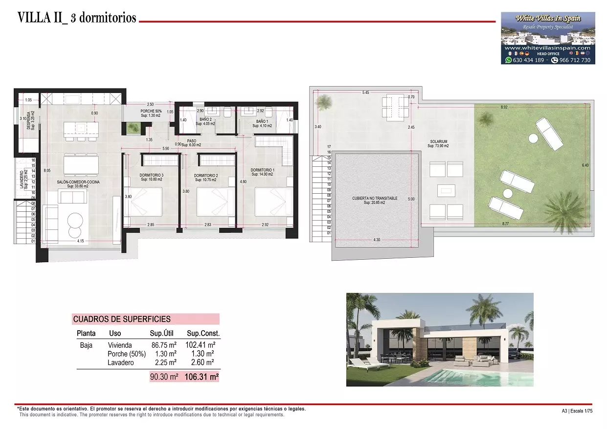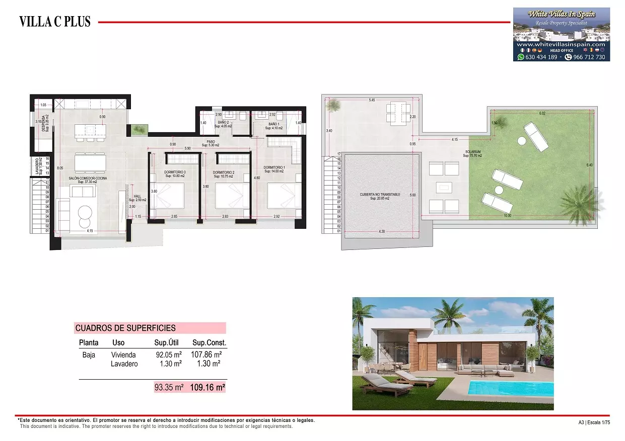 - Villa C Plus: The largest model, it also has 3 bedrooms and 2 bathrooms. The main entrance is positioned at the front of the dwelling, adjacent to the car drive and swimming pool. *Price: 349,000 €*