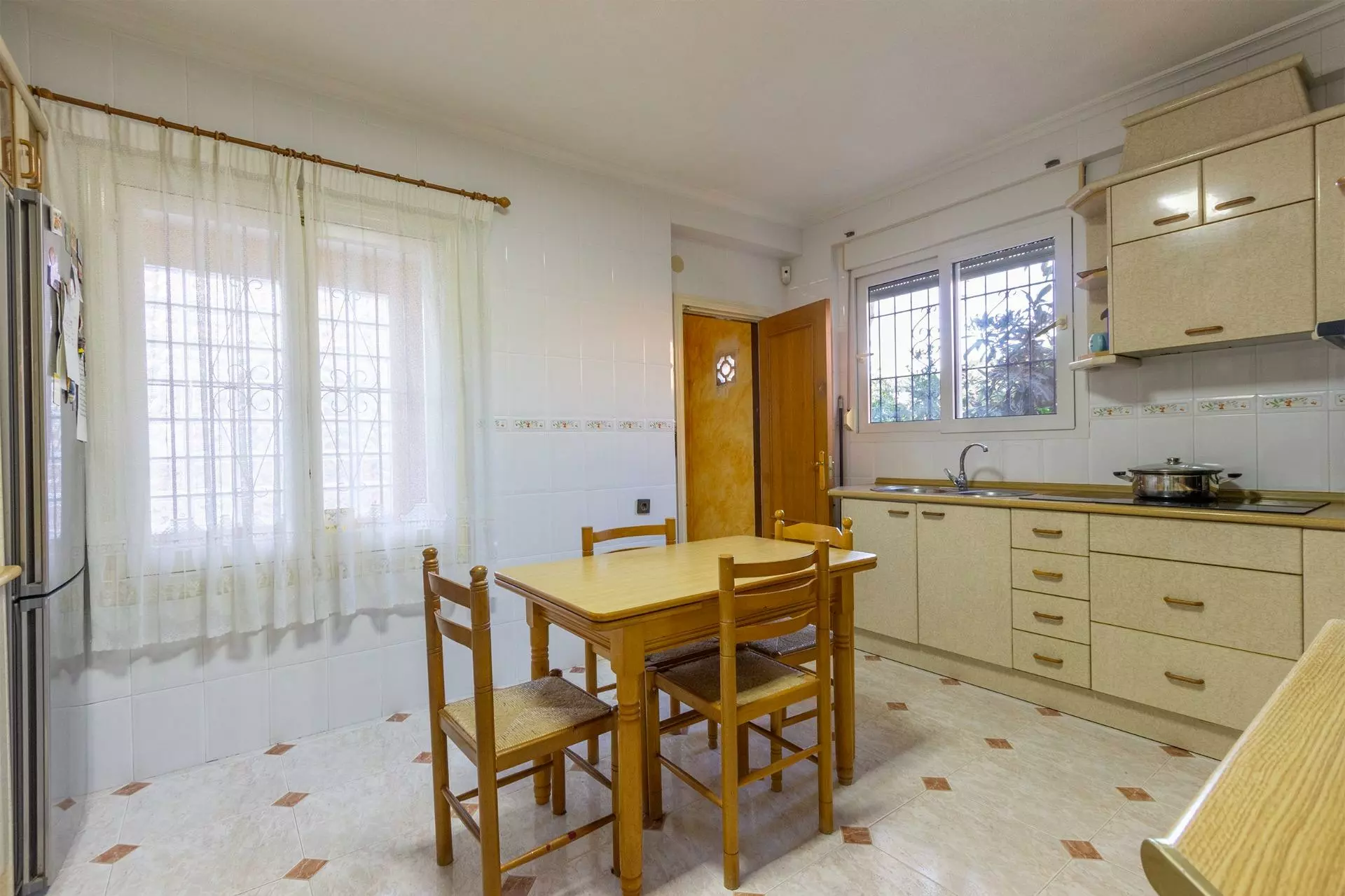 Inside, the villa includes an open-plan living area that connects seamlessly to the kitchen. The kitchen is equipped with standard appliances, offering utility for cooking and dining. The living area is complemented by large windows, which allow for natural light to fill the space. The property also features built-in closets in the bedrooms for additional storage.