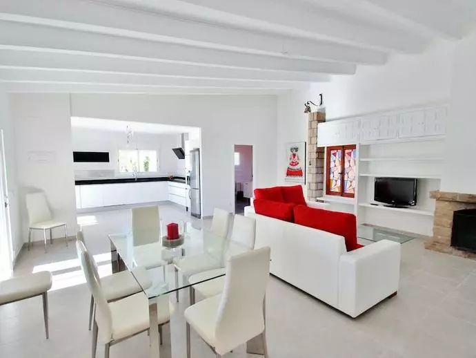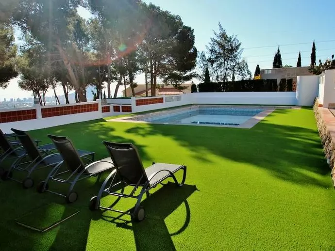 This residence comprises five bedrooms and three bathrooms spread across two levels, providing ample living space. The design incorporates both covered and uncovered terraces, allowing for outdoor activities or relaxation. The inclusion of a swimming pool enhances the outdoor experience, while the barbecue area adds convenience for those who enjoy outdoor cooking.