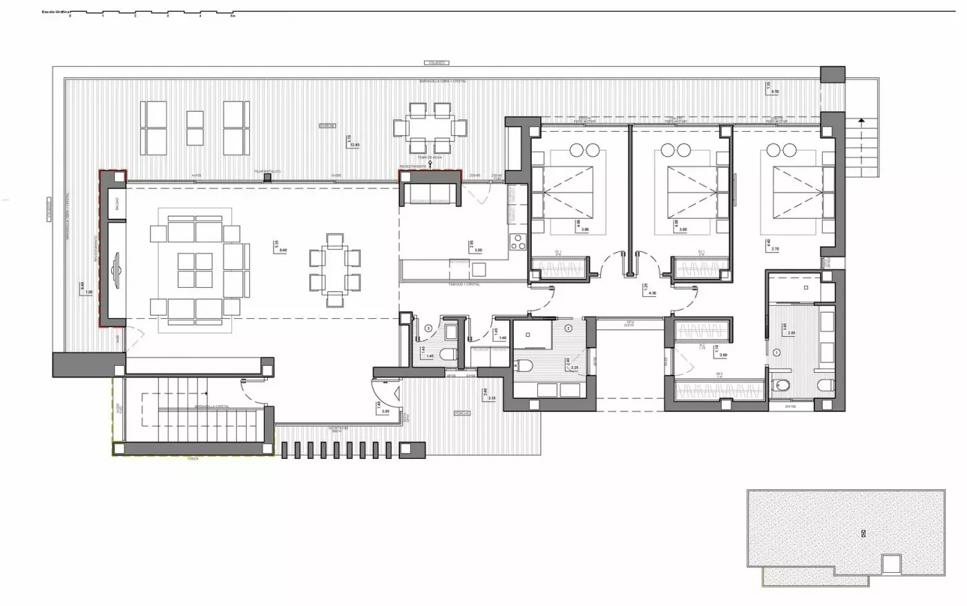 This villa spans two levels. The main entrance is positioned on the upper floor, which features two distinct wings. On the right, you’ll find the private area that houses three bedrooms. One bedroom comes with a sizable walk-in closet and an en-suite bathroom, while the other two bedrooms share a bathroom and each has ample wardrobe space. All bedrooms provide direct access to the terrace, where you can enjoy remarkable sea vistas.