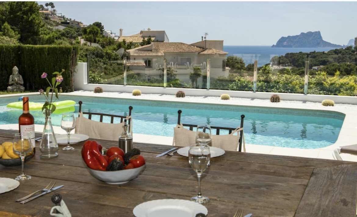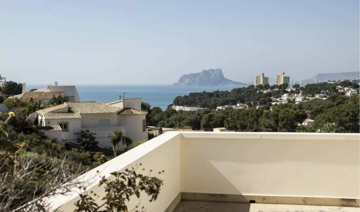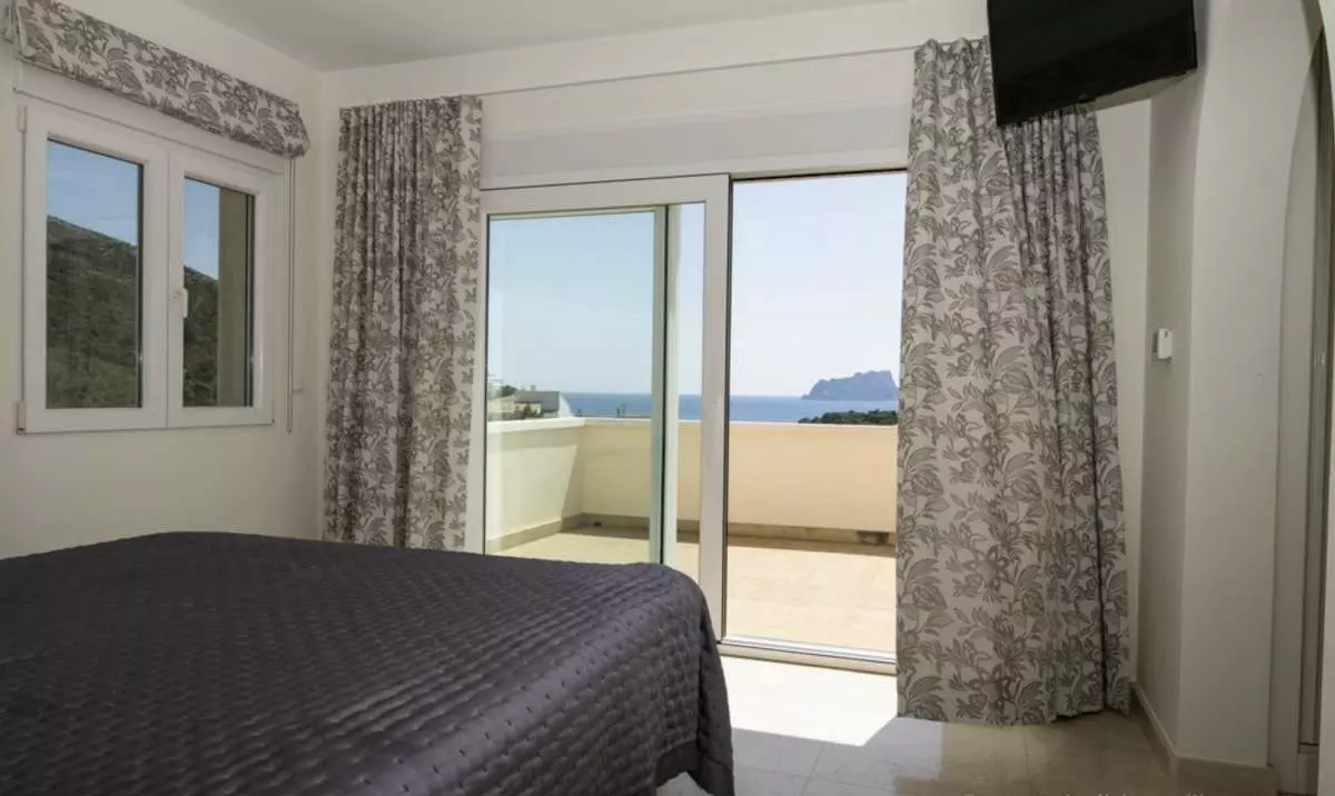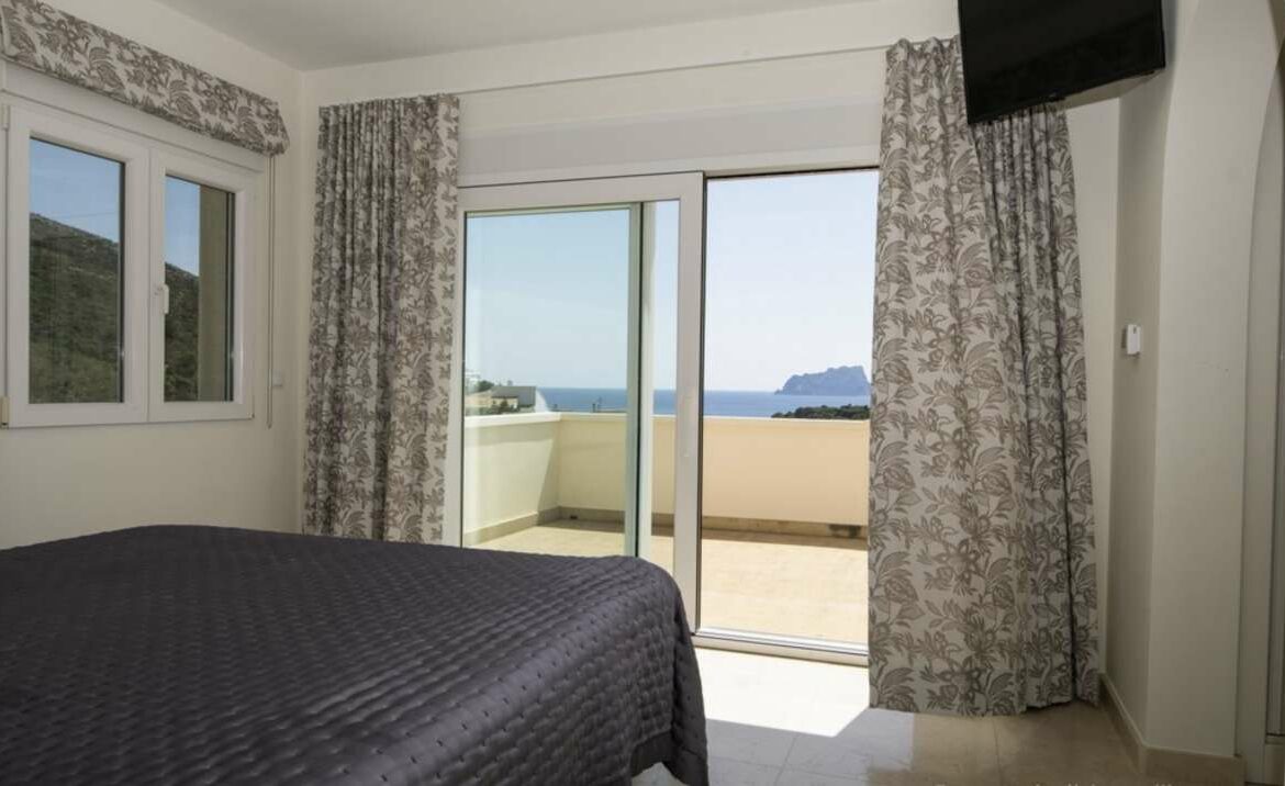 The villa provides four distinct bedrooms, all featuring en-suite bathrooms, televisions, and air conditioning units. The master bedroom benefits from a large private balcony that offers panoramic views of the sea and the Sierra Bernia mountains, creating an appealing space for relaxation.