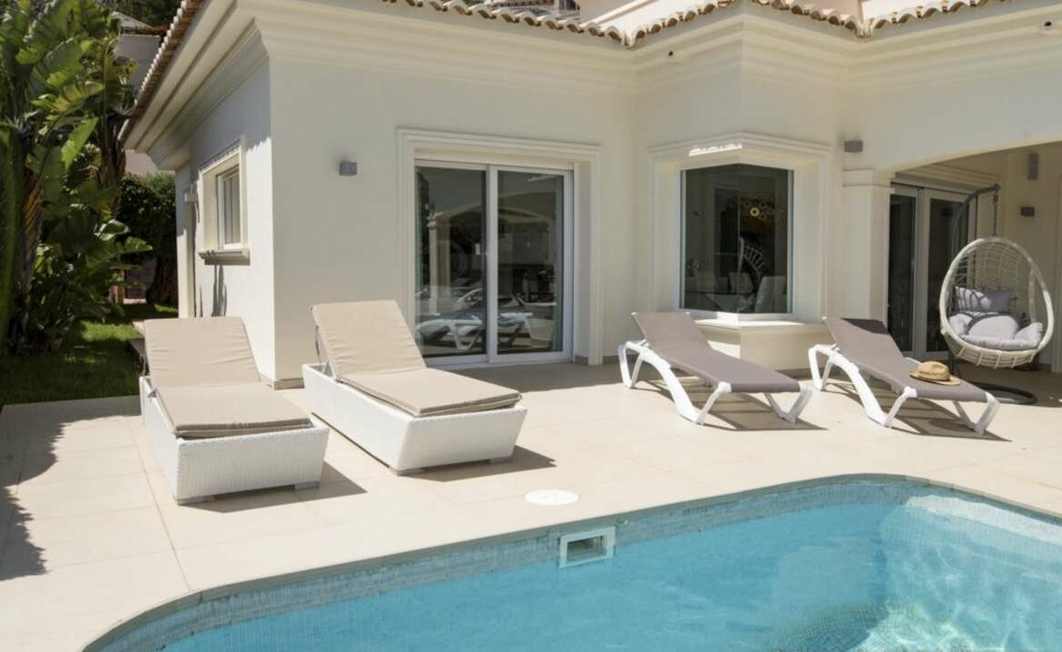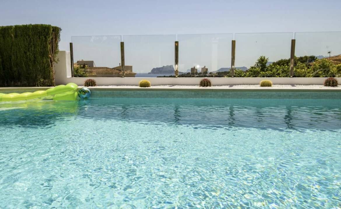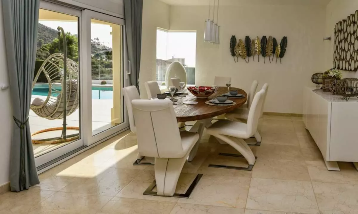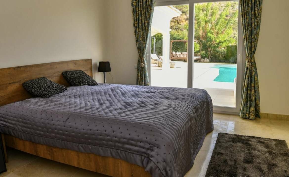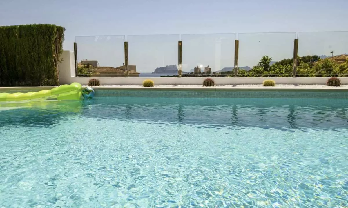 The villa provides four distinct bedrooms, all featuring en-suite bathrooms, televisions, and air conditioning units. The master bedroom benefits from a large private balcony that offers panoramic views of the sea and the Sierra Bernia mountains, creating an appealing space for relaxation.