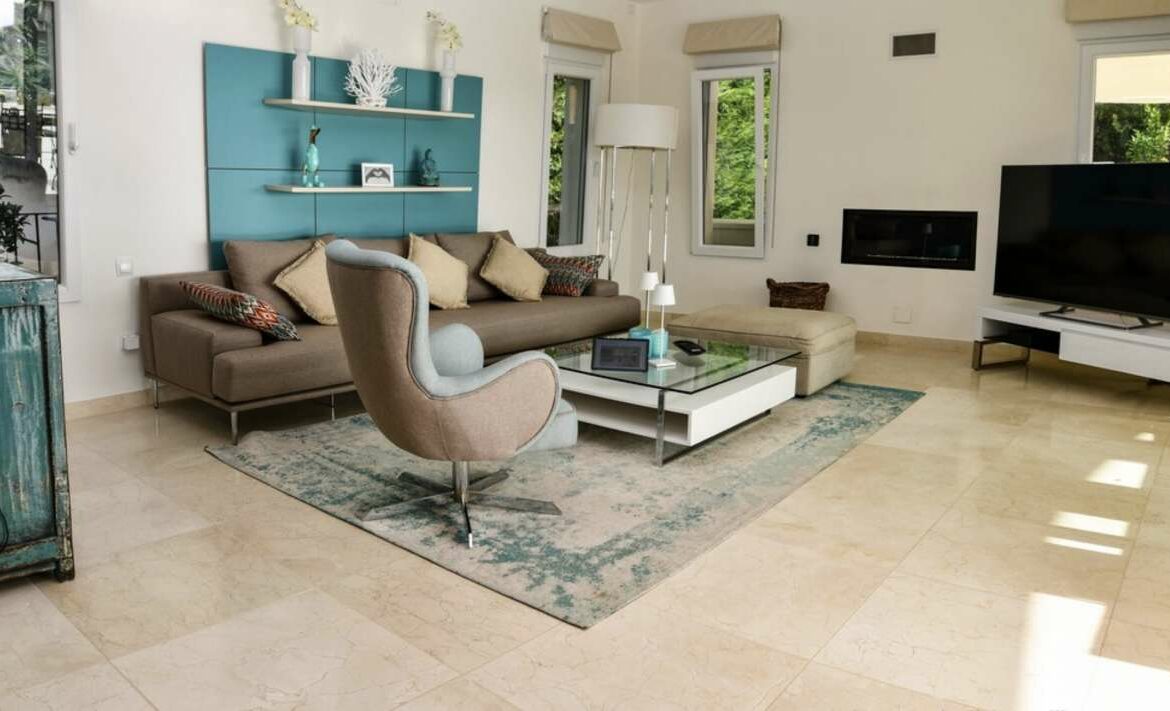 Inside, the villa features a bright and open living and dining area that not only benefits from direct terrace access but also showcases explicit sea views. For energy efficiency, underfloor heating, double-glazed windows, and electric shutters are included. A photovoltaic solar system further assists in energy consumption management, making this property more cost-effective during daylight hours.