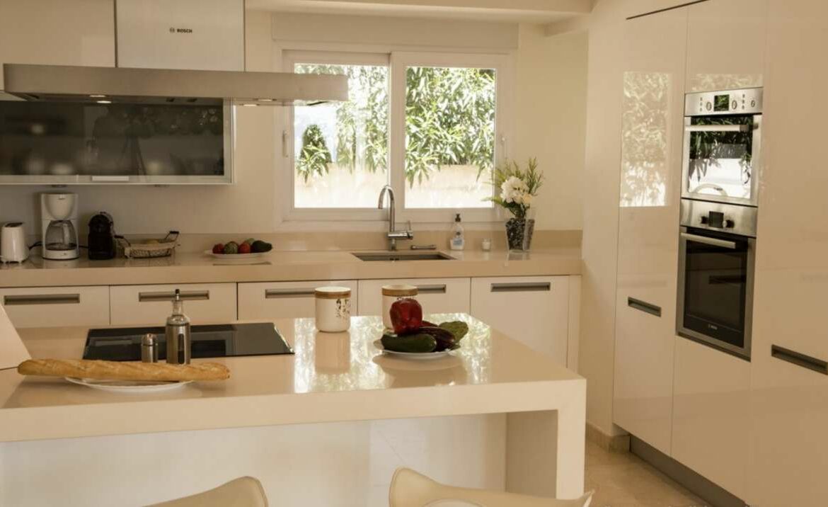 The modern American kitchen is fully equipped with Bosch appliances, including a ceramic cooktop, oven, dishwasher, microwave, coffee machine, and toaster. The cream marble flooring extends throughout the entire home, contributing to a clean and functional aesthetic.