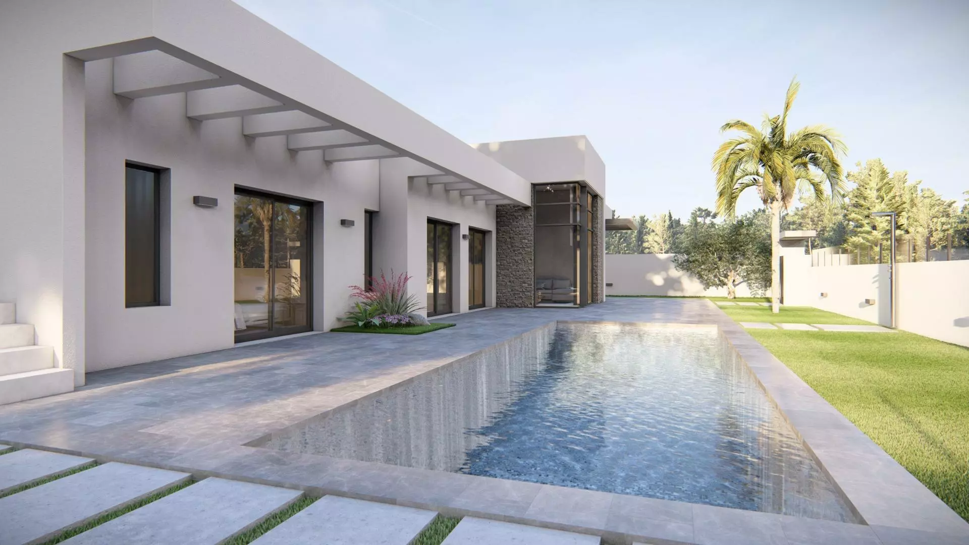 The villa is one-level with a basement, featuring 3 bedrooms, 2 bathrooms (including an en suite), and an additional guest toilet. The open-plan living space integrates a modern, fully-equipped kitchen with dining and lounge areas. This area connects seamlessly to a terrace and a private 9.5 x 3.3 m swimming pool. The basement offers a garage suitable for two cars along with storage options, while an exterior staircase leads to a private rooftop solarium measuring around 60 m², ideal for sunbathing or enjoying views of the surroundings.