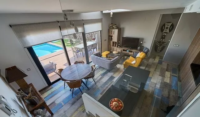 The ground floor is designed with an open kitchen that comes fully equipped with high-quality appliances. This kitchen seamlessly connects to a custom-designed living room which boasts direct access to the terrace, garden, and a private pool. The pool area also has the option for heating during winter months, making it a versatile feature for year-round enjoyment.