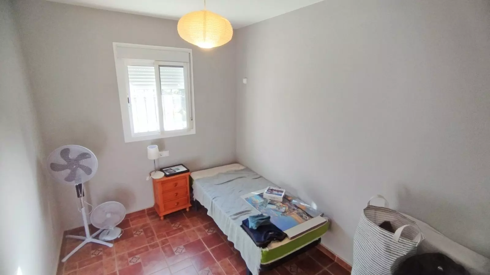 This house is situated on approximately 2,933 square meters of flat land, providing ample outdoor space. The home itself covers about 83 square meters, featuring two bedrooms and one bathroom. The living room includes a fireplace, adding a functional element to the space. The kitchen is designed for practicality, and there is a 12 square meter covered terrace that can enhance your outdoor dining experiences.