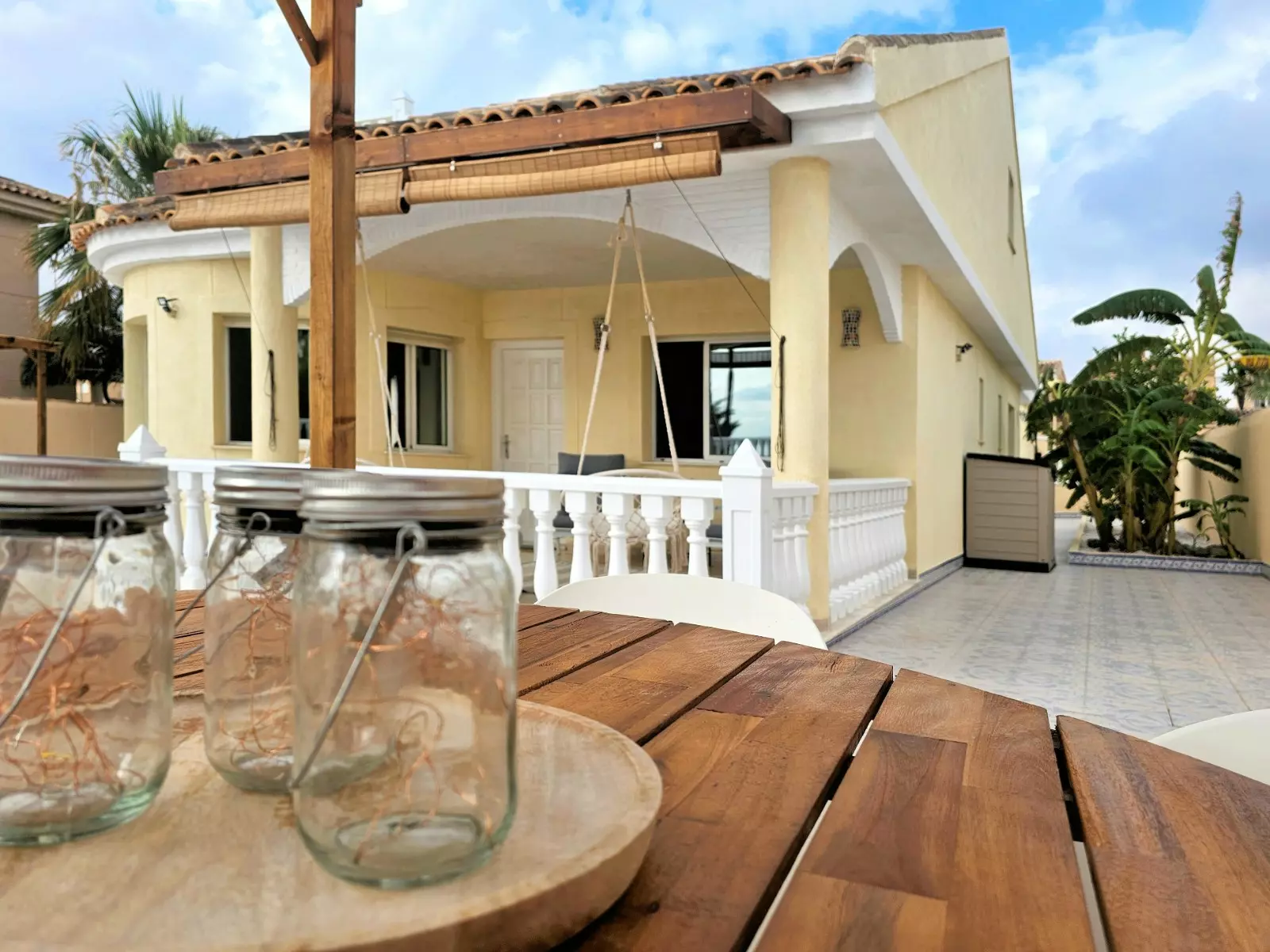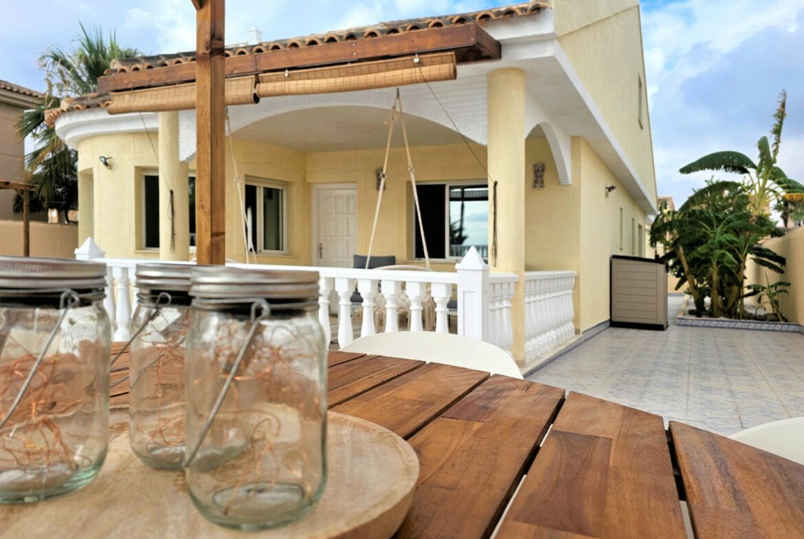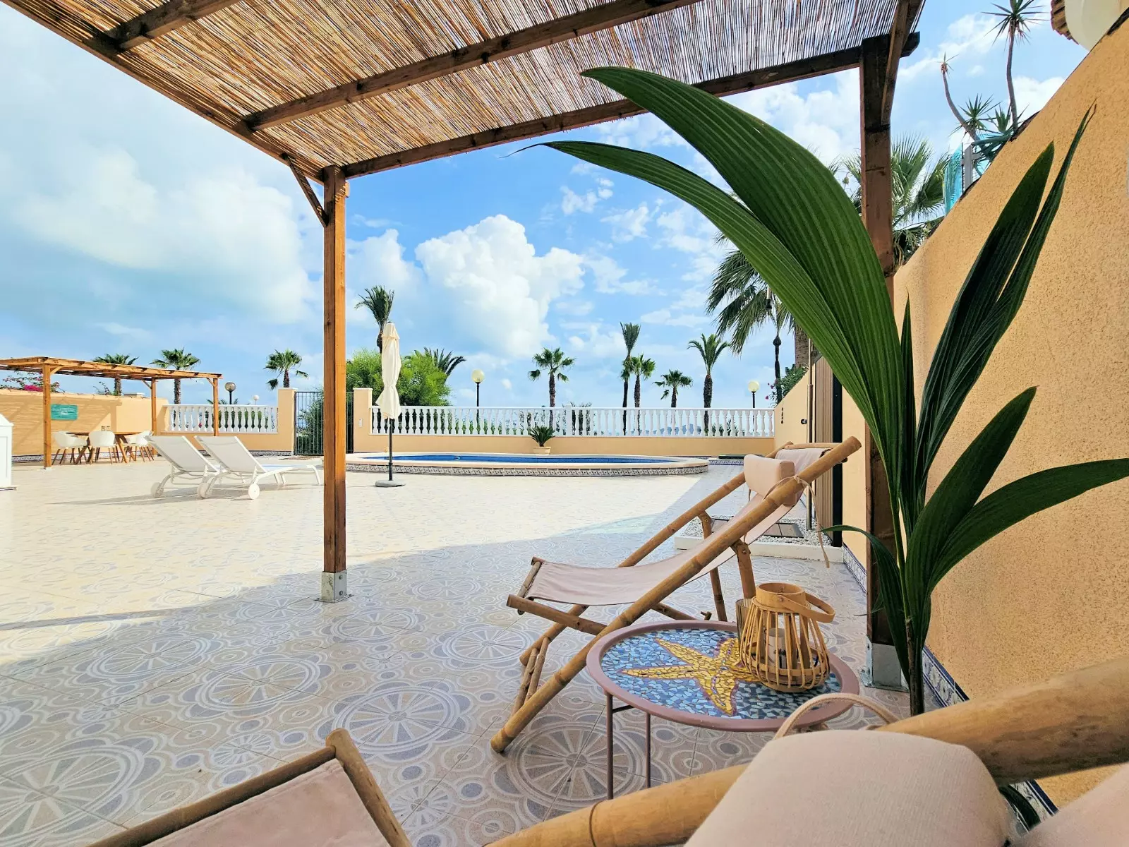 This villa is positioned in the neighbourhood of Estrella de Mar, nestled in a tranquil area surrounded by greenery and directly adjacent to the beach of the Mar Menor.