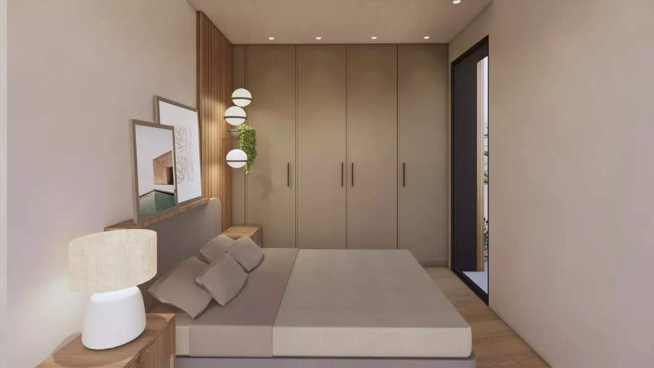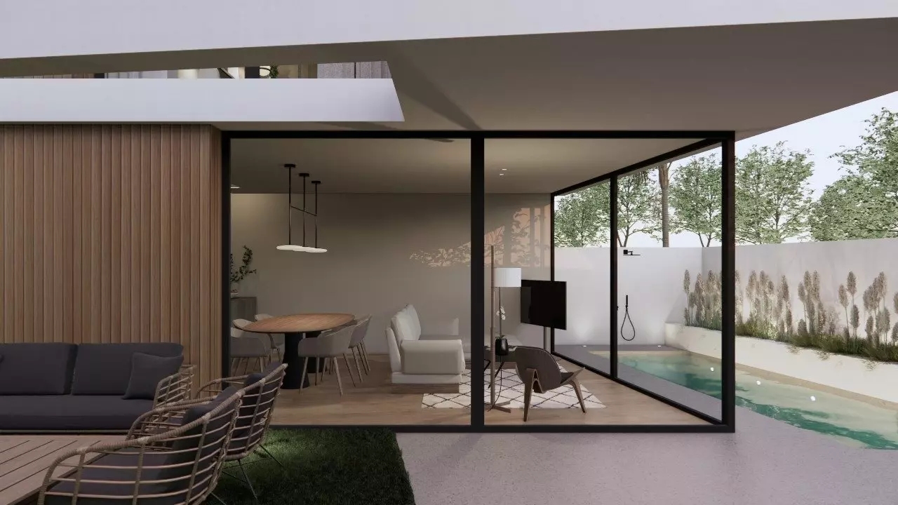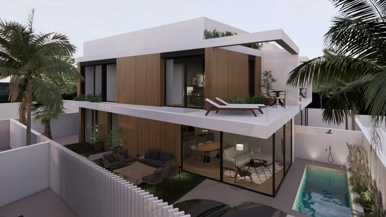 Each villa features three bedrooms and three bathrooms, accommodating various living arrangements. The open kitchen connects seamlessly to the living room, promoting a modern living atmosphere. Outside, you’ll find a private garden with a pool, perfect for outdoor activities. Each property also includes dedicated parking space, ensuring convenience for residents.