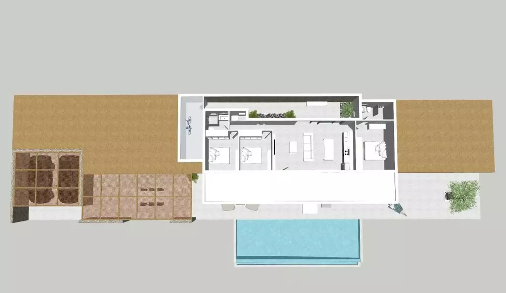 The villa features a living room that integrates nicely with the kitchen area, providing a functional layout for day-to-day activities. Additionally, there are two shower/WC facilities, ensuring convenience for both residents and guests. A storeroom is also available for storage needs, which is a valuable asset for maintaining an organized living environment.