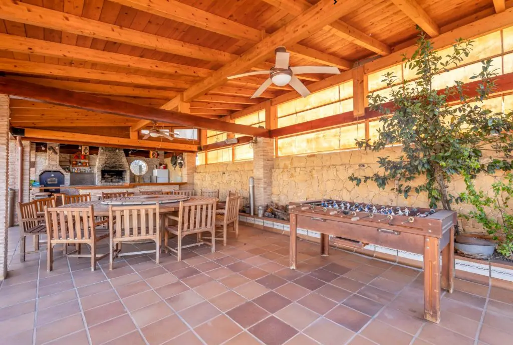 This villa includes five bedrooms, four of which are double rooms. Two bedrooms are equipped with en-suite bathrooms and walk-in closets, allowing for both privacy and convenience. All bedrooms come with built-in wardrobes and large windows that ensure plentiful natural light. The property has four full bathrooms and one guest toilet, two of which are en-suites attached to the main bedrooms. A third full bathroom adjacent to the pool area adds to the practicality of the home.