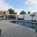 Finding a distinctive property can be challenging, but this villa stands out. It’s situated in an enclosed plot, providing a sense of privacy and security. Upon arrival, an electric gate opens to reveal a large driveway, complete with a fountain. This driveway is crafted from stamped concrete and adorned with mature palm trees, adding to the overall ambiance. For vehicle protection, a wooden carport accommodates two cars or motorbikes, keeping them shaded from direct sunlight.