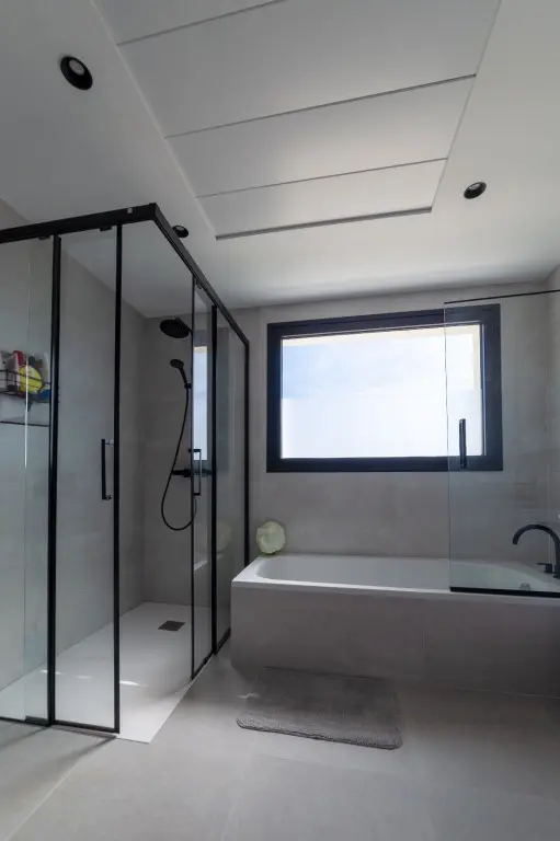 As you enter the villa, you are greeted by a hall that includes a wardrobe for added convenience. To the left, you will find the dining and living room area. This space is complemented by an open kitchen, which provides a view of the pool and the covered terrace. Large windows in this area create an environment filled with natural light, contributing to a comfortable ambiance.