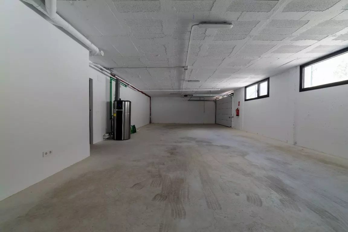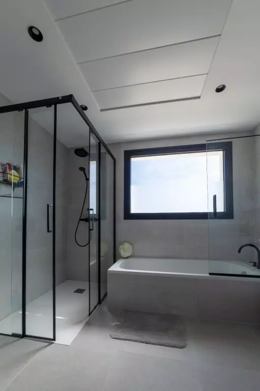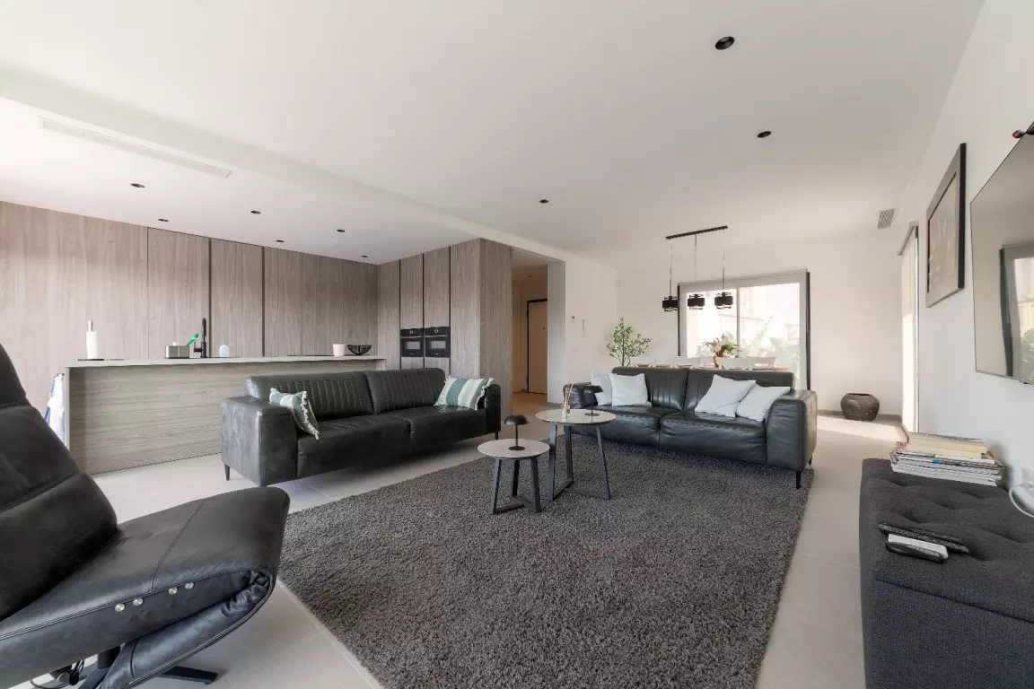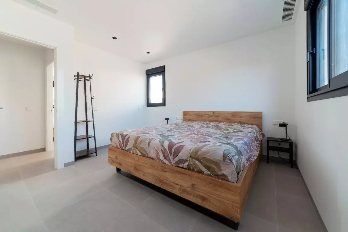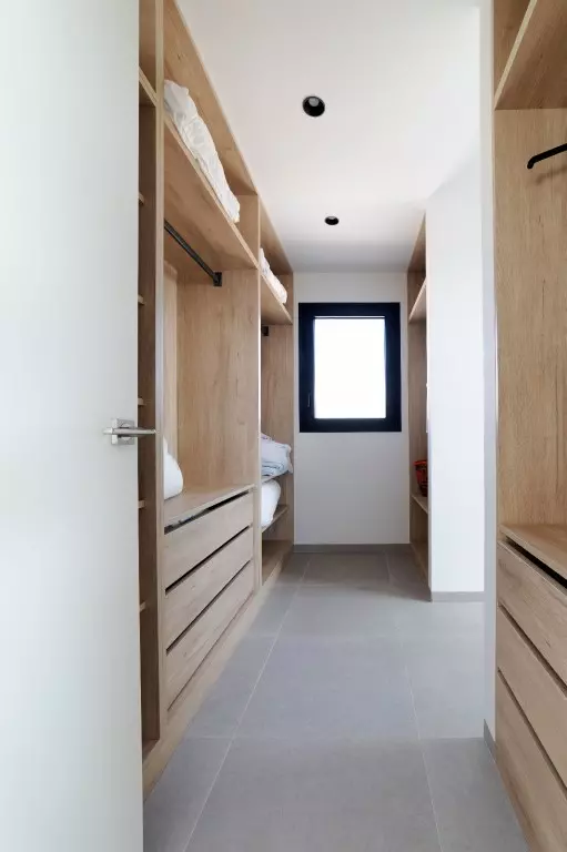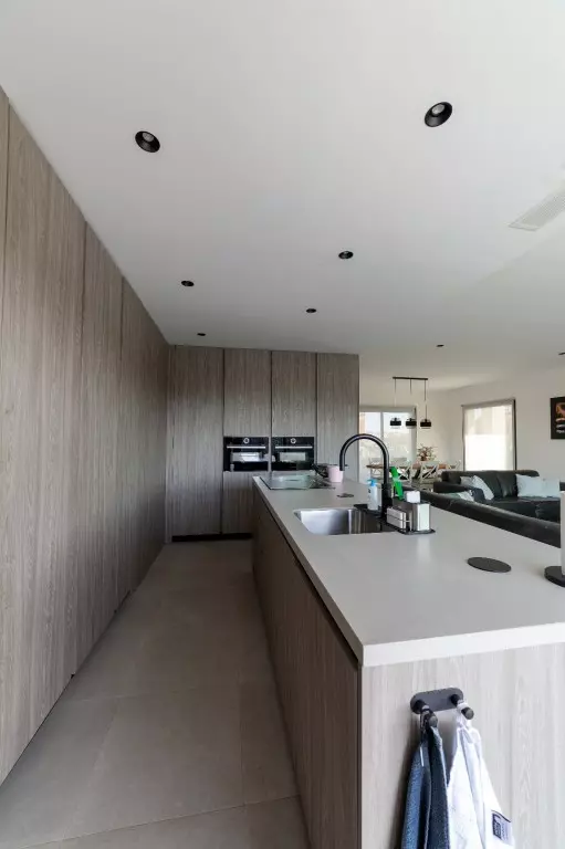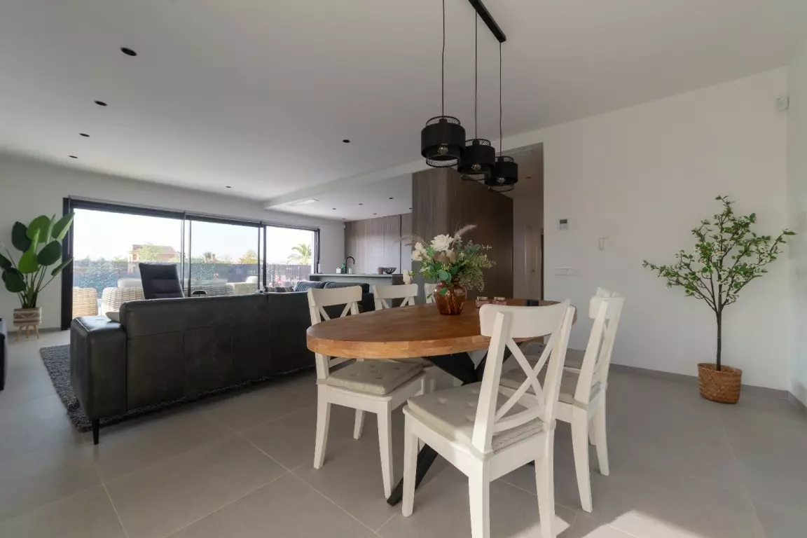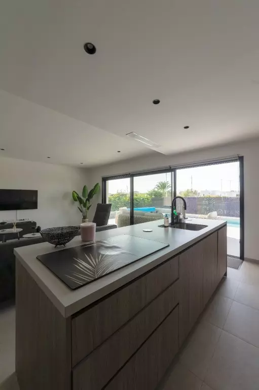 As you step into the villa, you’re greeted by a hall that includes a wardrobe for added convenience. To the left, a combined dining and living room awaits your attention, seamlessly flowing into a comprehensive kitchen. This kitchen stands out with an unobstructed view of the pool and covered terrace, ideal for enjoying warm weather days. Essential appliances, including a large refrigerator and freezer, enhance the kitchen’s functionality. The presence of two combination ovens with microwaves and an induction hob allows for varied cooking options. Large windows fill the space with natural light, serving both aesthetics and ambiance. Behind this area, a laundry room offers additional utility.