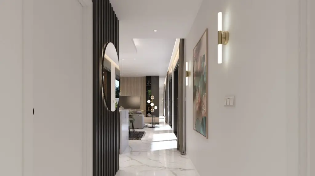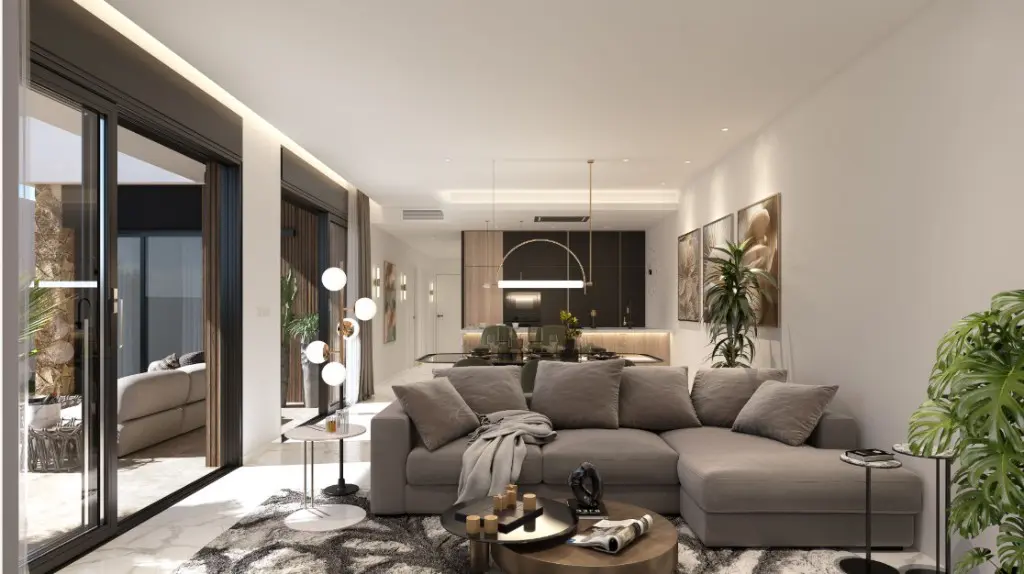 The villas typically consist of one level and include three bedrooms and two bathrooms. A living room and kitchen offer ample space for daily activities, while the private terrace provides an area to enjoy the outdoors. Each villa features a private swimming pool, solarium for sunbathing, and landscaped gardens that enhance the visual appeal of the property.