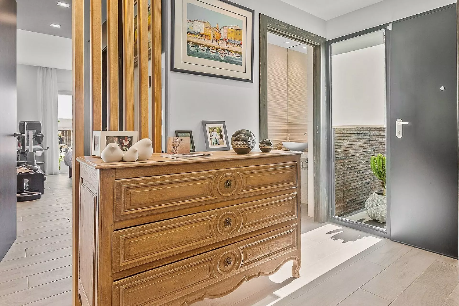 Currently, one of the bedrooms is set up as a dressing room or an office. This flexible space can easily be transformed into an extra bedroom, catering to various living arrangements.