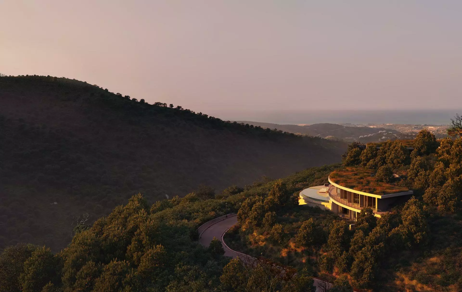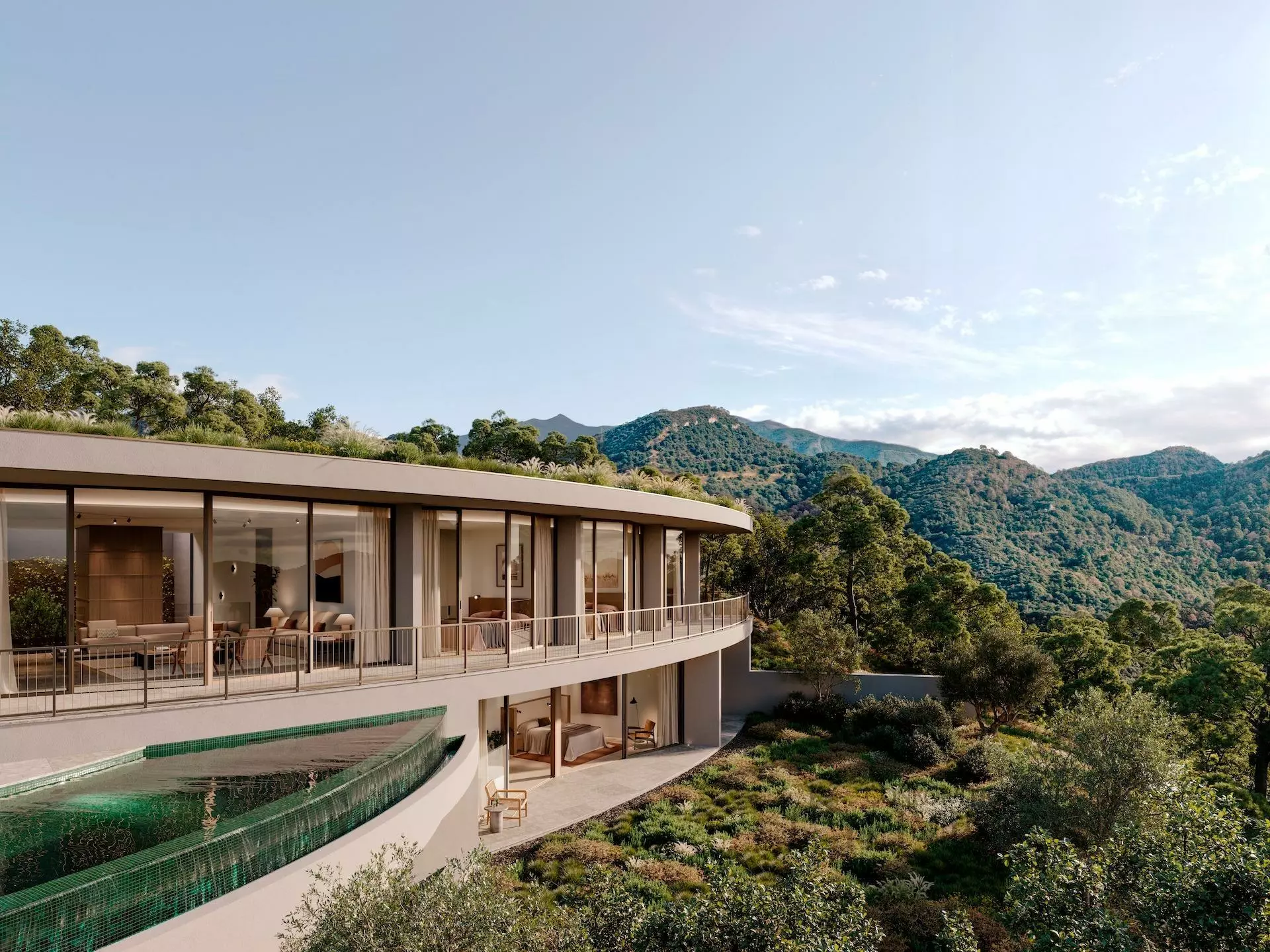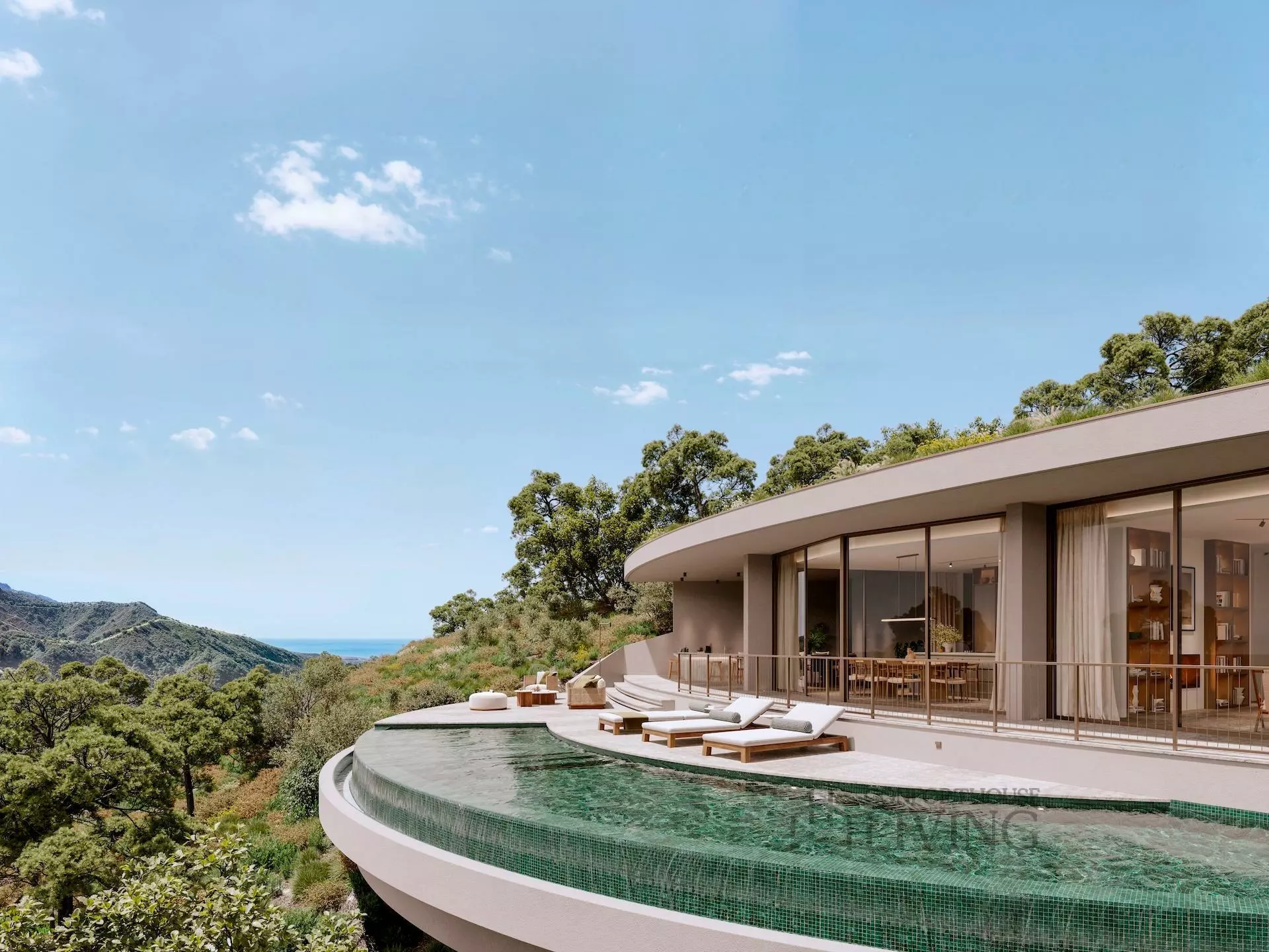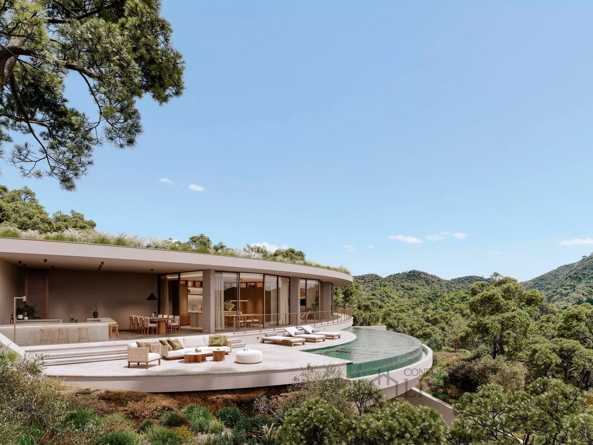 Villa I3 lies elegantly at the foothills of Monte Mayor, offering a unique architectural design that blends seamlessly with its natural surroundings. This property features smooth curves that frame panoramic views of the lush valley, pine-covered slopes, and the Mediterranean Sea. The design aims to blur the boundaries between indoor and outdoor spaces, allowing occupants to connect with nature throughout the year.