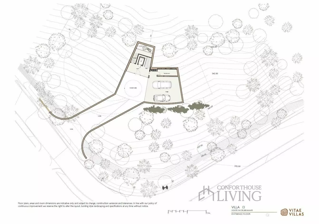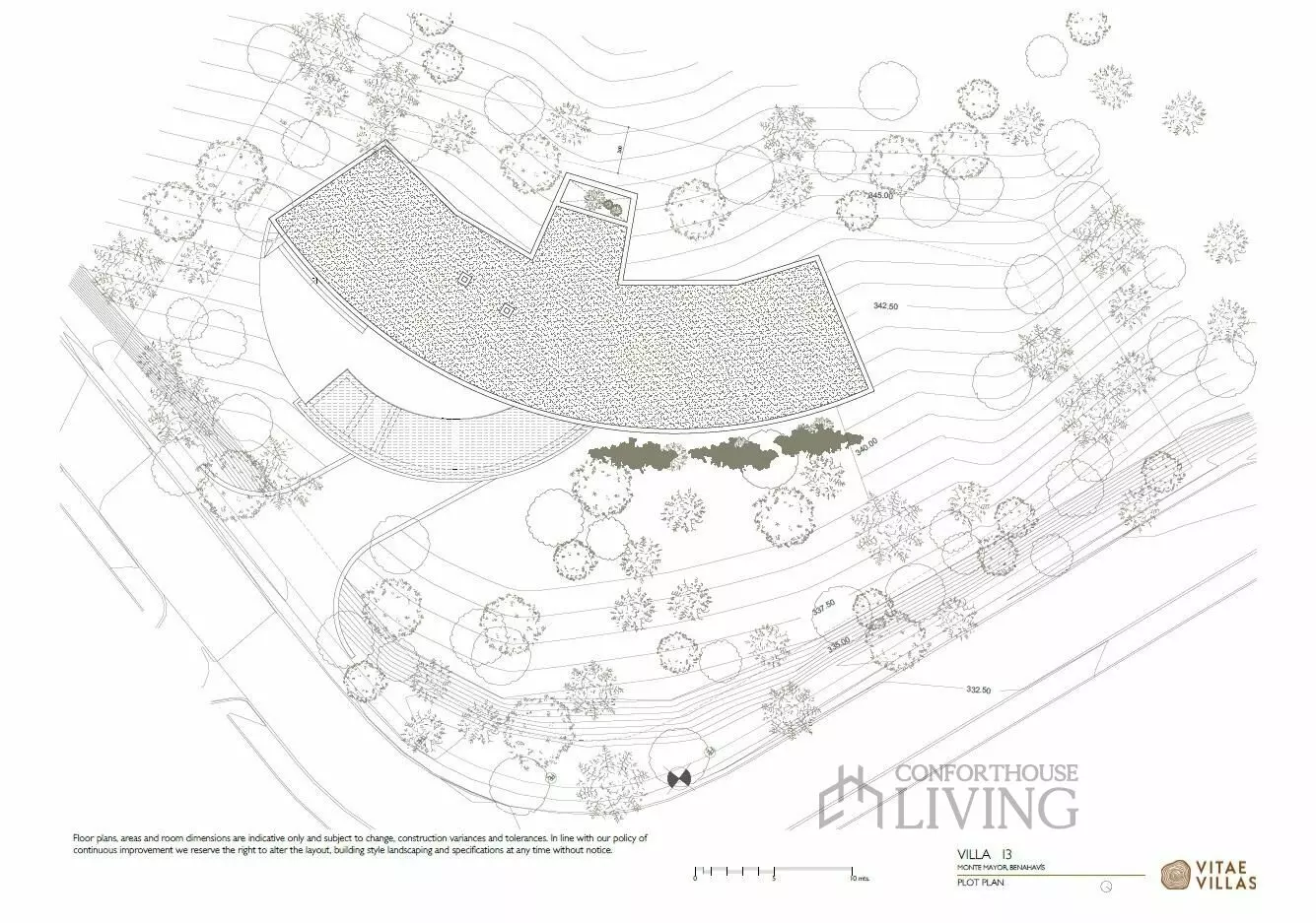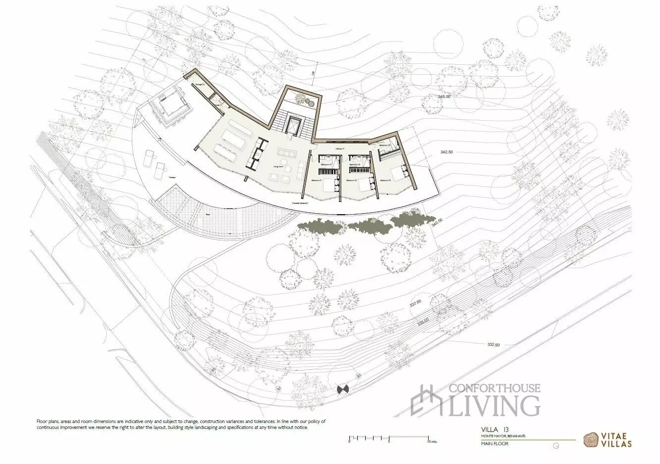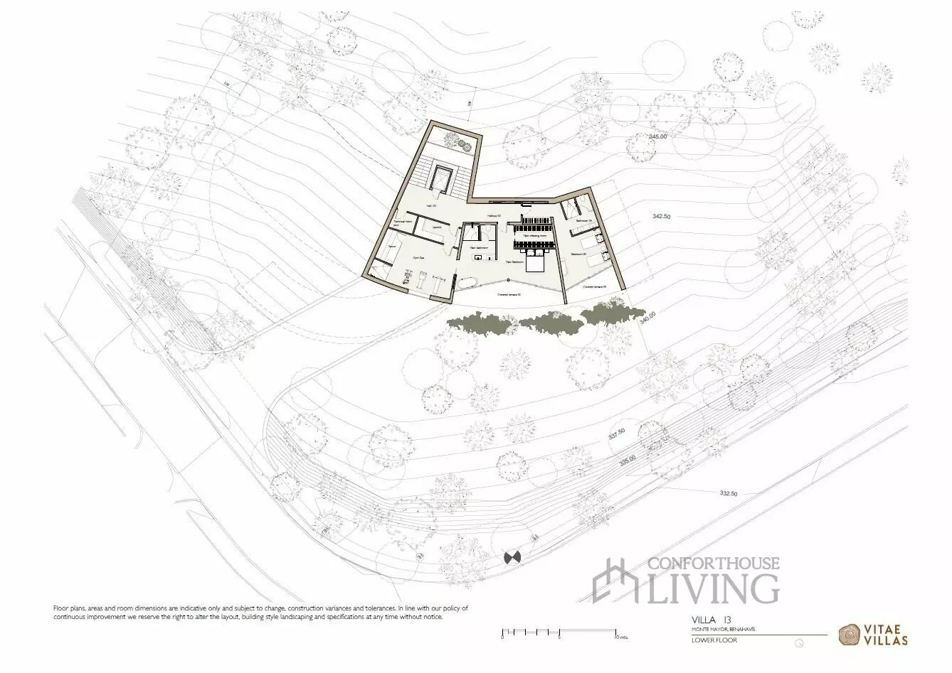 Villa I3 lies elegantly at the foothills of Monte Mayor, offering a unique architectural design that blends seamlessly with its natural surroundings. This property features smooth curves that frame panoramic views of the lush valley, pine-covered slopes, and the Mediterranean Sea. The design aims to blur the boundaries between indoor and outdoor spaces, allowing occupants to connect with nature throughout the year.